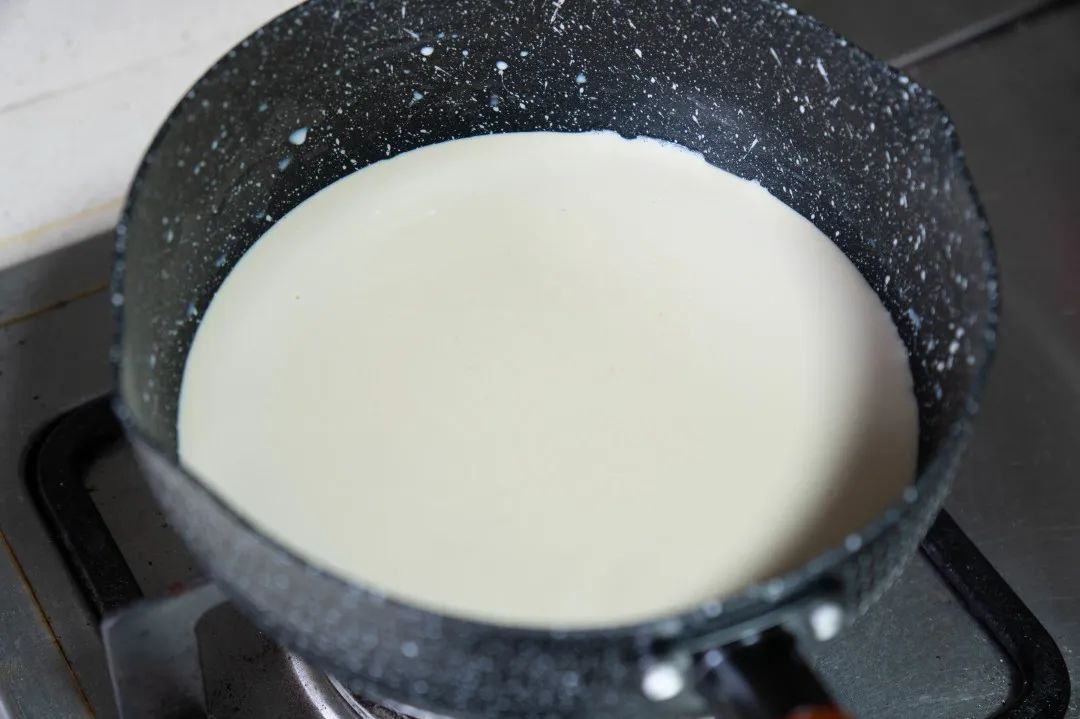 5.锅中倒入300毫升牛奶以及奶粉和黑糖,小火煮至73度-80度之间