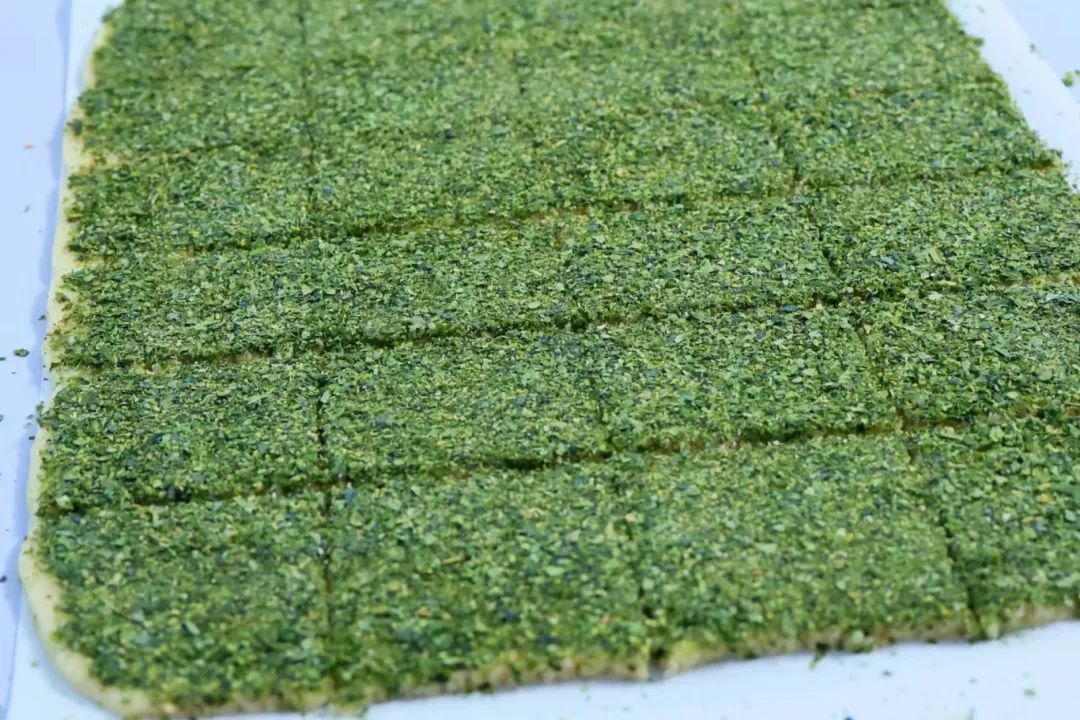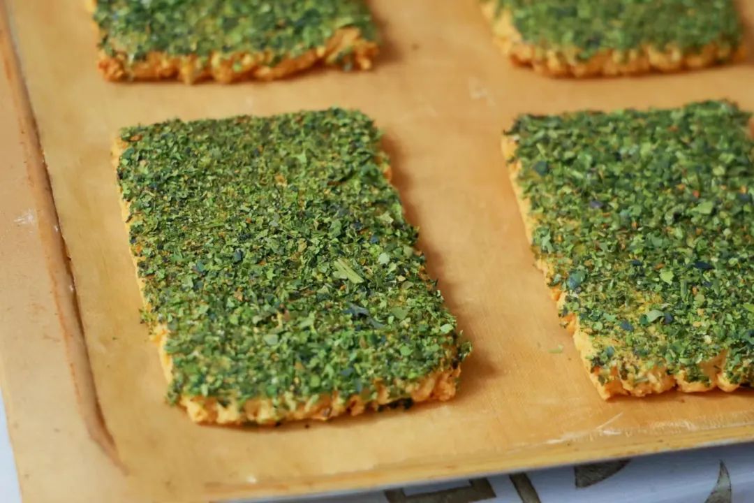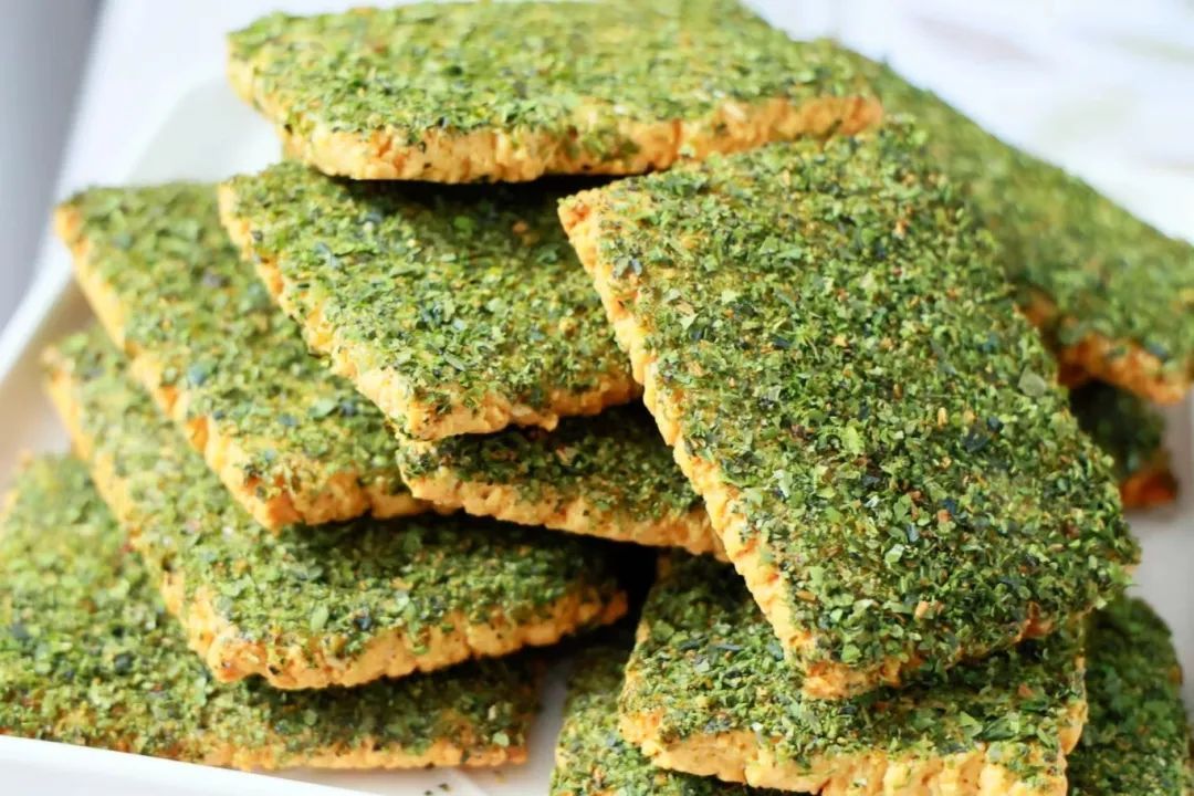 中筋面粉250克、海苔粉30克、糖粉90克、食用油55克、盐6克、水50克、蛋液30克、麦芽糖50克(其中20克涂抹用)、小苏打4克、泡打粉3克、白芝麻若干