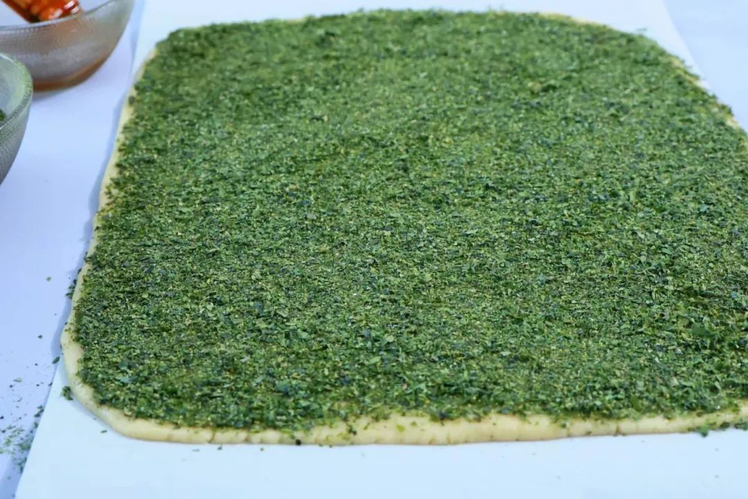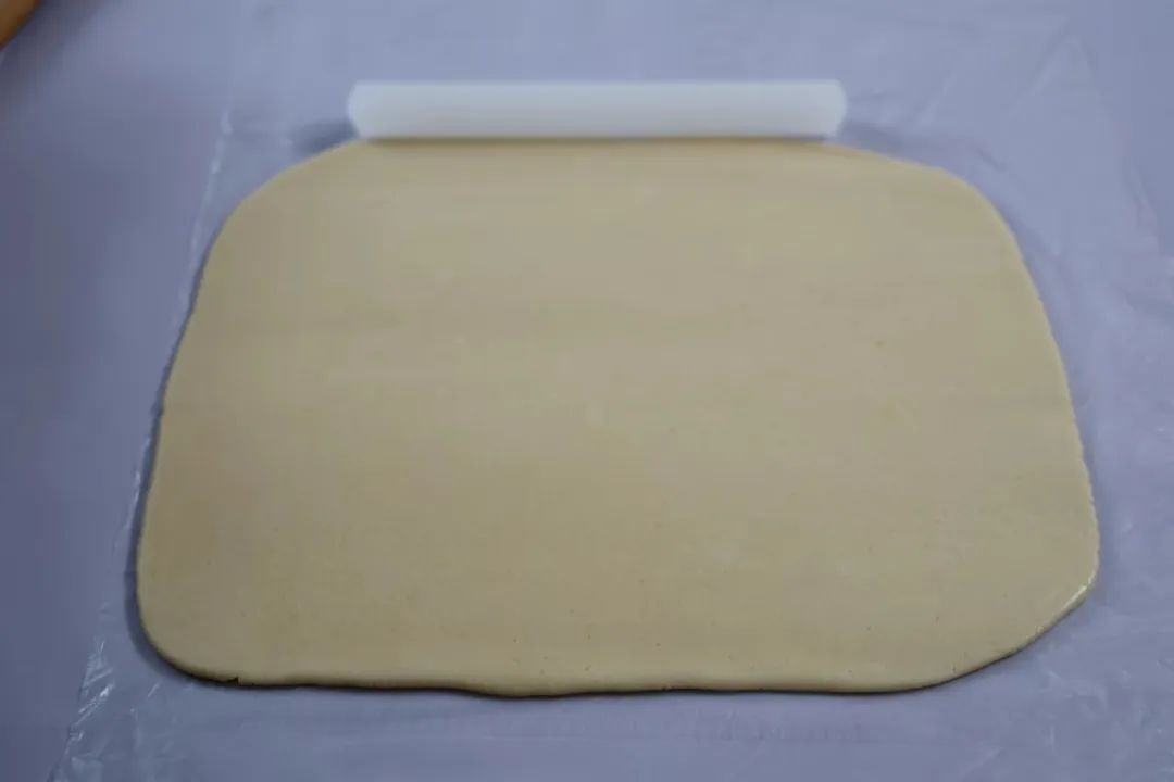 2.轻揉成团,擀开薄至0.5厘米的长方形。