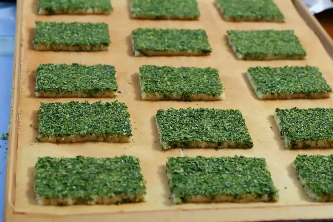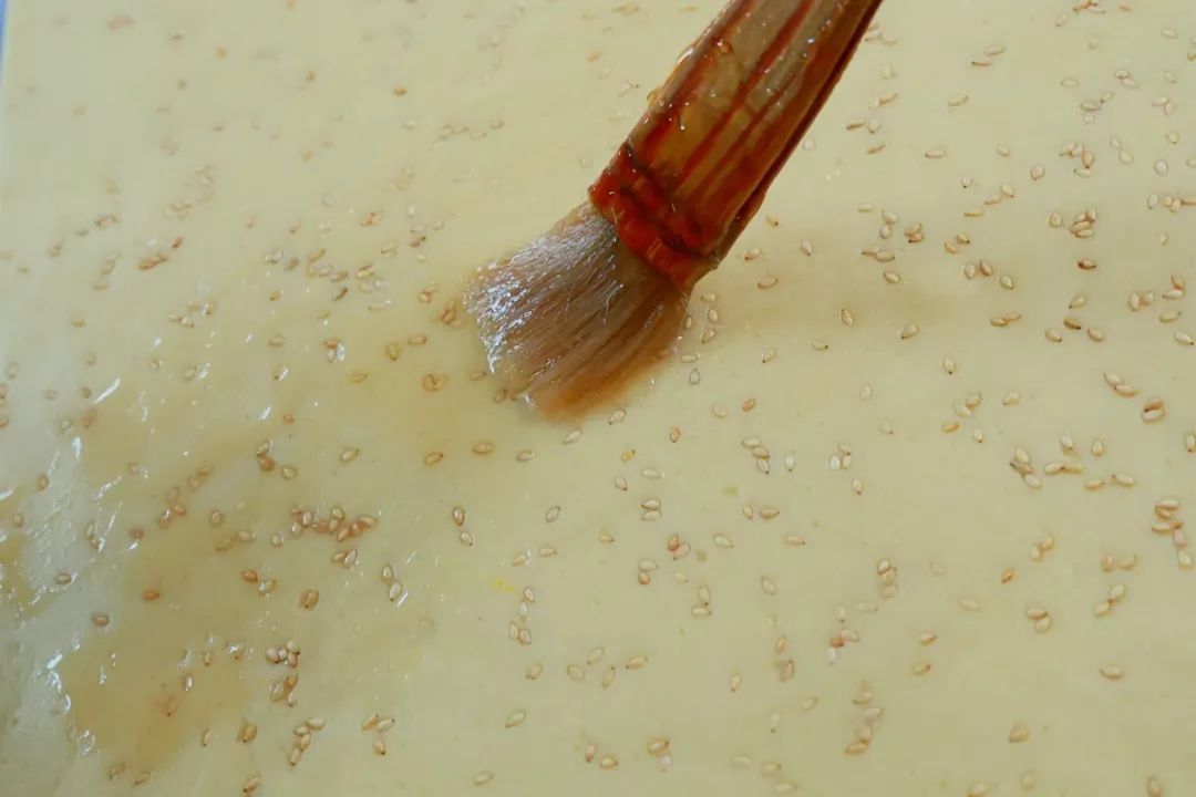 3.撒白芝麻,擀一下压实,麦芽糖20克、水20克调和,涂抹在表面。