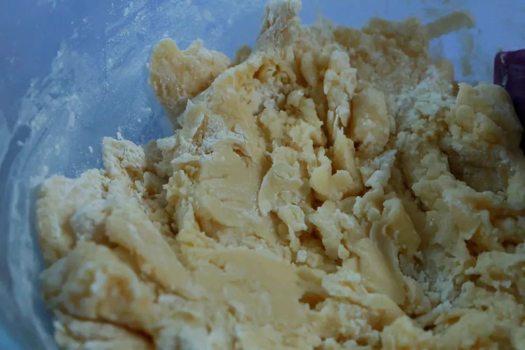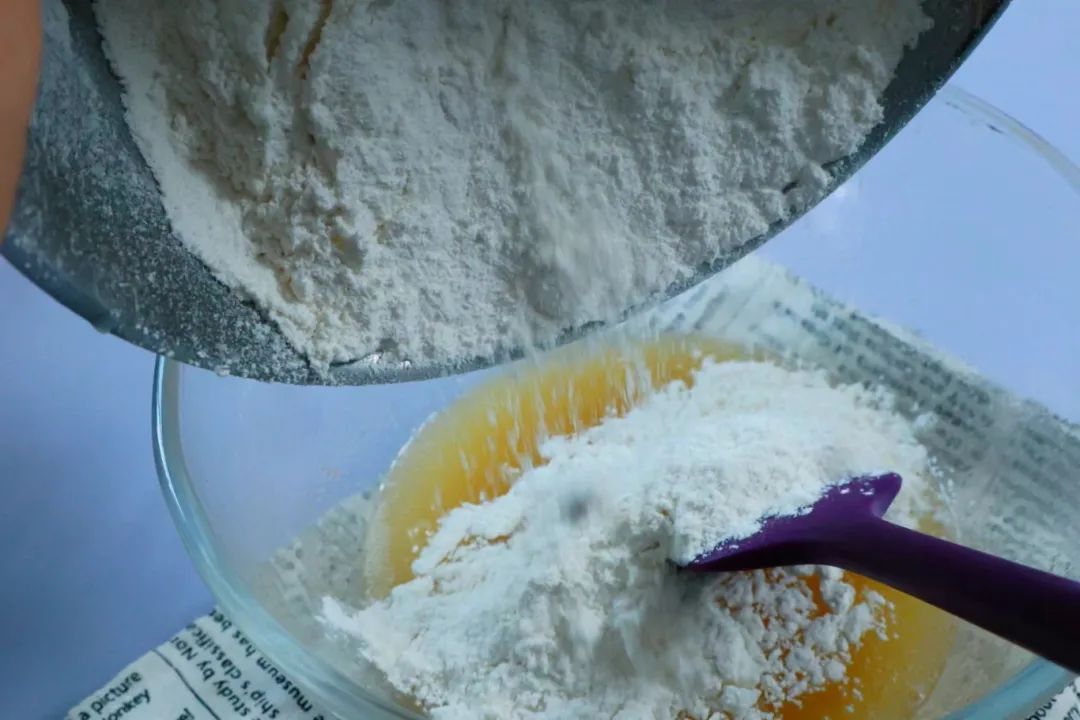 1.水、油、麦芽糖30克、蛋液混合,倒入糖粉、中筋面粉搅拌均匀,翻拌至无干粉。