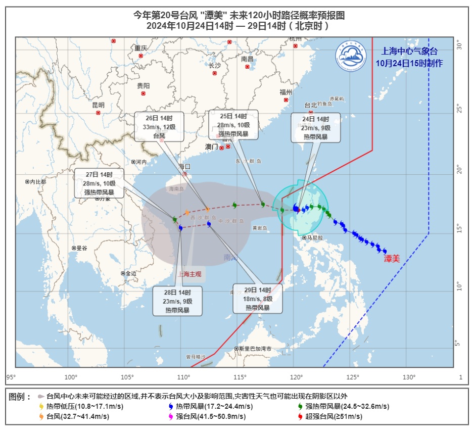 第20号台风“潭美”昨天14时中心位于菲律宾吕宋岛西部近岸,强度为热带风暴级。预计“潭美”将以每小时10~15公里的速度向偏西方向移动,强度逐渐增强,最强可达强热带风暴级或台风级,28日白天转向偏东方向移动,强度逐渐减弱。