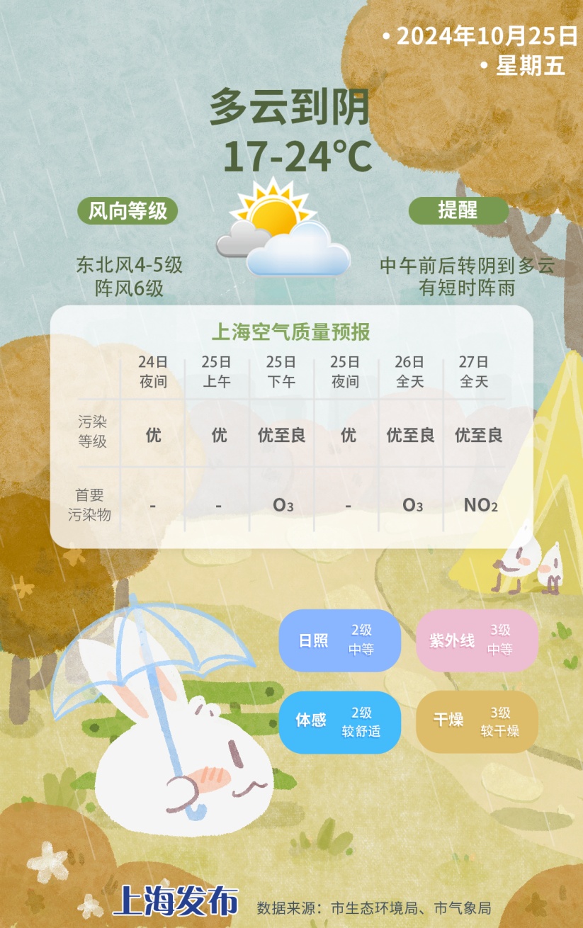 多云到阴,中午前后转阴到多云有短时阵雨。上午起风力增大,东北风4-5级阵风6级,沿江沿海地区5-6级阵风7级。今天最高温度24℃,最低温度17℃,相对湿度95%-50%。