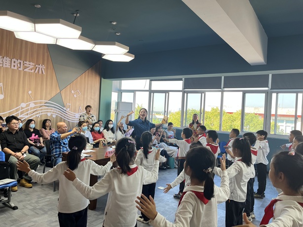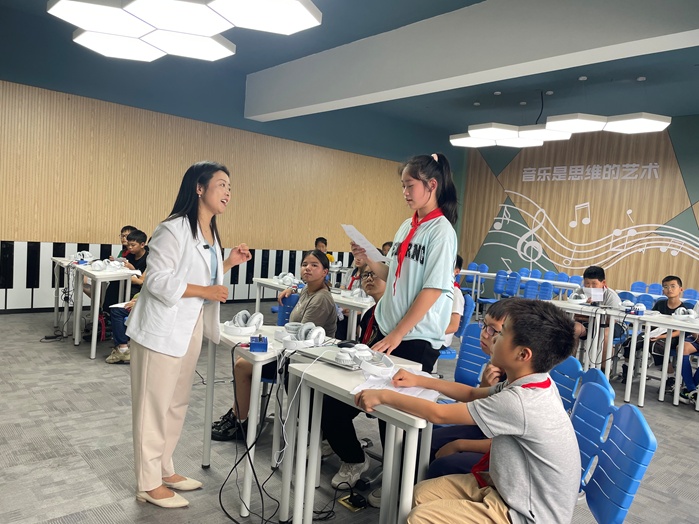 2021年开始,三年的时间里,学校小学音乐教学方式改变悄然发生:不再是老师“一言堂”,而是从学生角度出发;不再是学会几首歌那么简单,而是师生一起玩转音乐,用音符创编出曼妙旋律,碰撞出无尽想象力火花。改变传统音乐课堂上,一台钢琴,跟着老师学唱的单调模式,取而代之的是用“一个音叉”跟随老师来创作,学生的自主能动性更高,音准特别好,创造力、想象力被充分调动,音乐课堂悦动起来,激活学生成长。学校音乐教研组长蒋奕飞介绍,小学音乐学科的改变主要可以浓缩为:低年级推进顺序性音乐教学和中高年级进行教学的数字化转型来双管齐下。“这样的改变,作为参与其中的老师来说是痛并快乐的,这意味着打破以往的教学习惯,老师首先在知识的理解和讲授上要重塑认知,但看到学生们在玩中学,用常展常演的方式,提升自信感和课堂参与度,学习热情被点燃,作为老师很有成就感和获得感。”蒋老师举例说明,原来的节拍“大大大”变成了如今的“踢踢踏”,通过老师们设计的课堂游戏,把这样的知识点融在其中,教会孩子们在乐曲中把知识点识别出来。