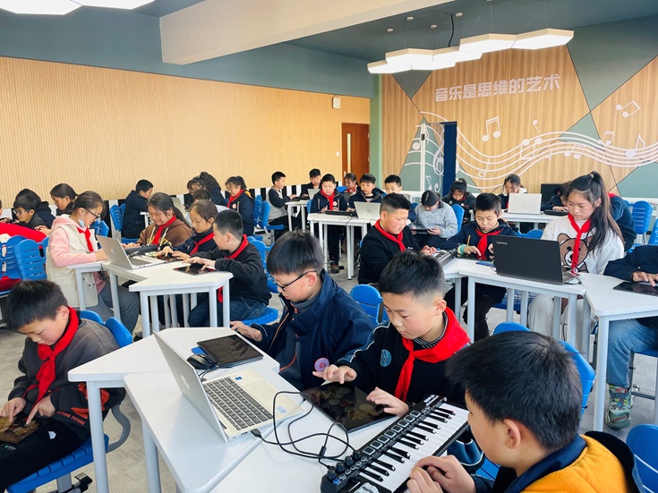 “难点很多,老师一定要精通数字化教学软件和设备的功能,在课堂教学中能够精准使用,使之助力课堂教学;潜心研究以学生为主体的课堂,应该怎样教才能把数字化手段融会贯通。不少学生是随迁子女,由于家庭条件限制,没有接触过电子产品,刚起步的阶段是教会大家都能掌握的基础的操作方法,和学知识、创编乐曲关系不大。”蒋老师表示,数字化的学习方式为孩子们的成长填补了知识的空白,在课堂上为他们打开了拓展知识边界的大门。在蒋老师的课堂中,学生们可以通过音乐制作软件肆意的创作,用简单易操作的数字模块编奏出美妙旋律。数据库中可以听到、触碰到多种民乐器、西洋乐器的声音和知识,有了这样的知识储备,会为学生的未来发展播下音乐的种子,发掘出无限的潜能。通过大家的不懈努力,2022年12月19日,学校顺利通过了市、区专家对数字化转型项目的调研工作,得到了一致认可。2023年6月21日,在嘉定区级数字化专题教育活动上,通过课例展示、学生数字化活动展示和虚拟乐队展示向各界呈现了音乐学科数字化转型实践的具体成果。课堂的转变和学生的成长离不开教师能力和教学质量的提升。学校抓住了正高级教师市教研员席恒老师和艺术学科丁志红老师流动到校的契机,副校长刘婧作为新晋的正高级教师、市音乐学科中心组成员、区音乐学科带头人和名师工作室主持人,把学校列为种子计划基地和名师工作室基地,为教研组请专家、引资源,建项目,把音乐教师吸纳入各种高端项目中实践学习等,让音乐老师们在短短三年时间里,在教科研水平、课堂教学质量方面突飞猛进,拓宽学科边界和眼界。