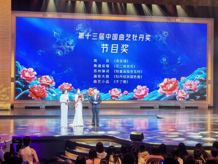 交汇点讯 10月26日晚,“南通牡丹颂”——第十三届中国曲艺牡丹奖颁奖仪式暨惠民演出在南通大剧院举行。由南通市通州区选送的说唱《花二侯卖花》斩获本届曲艺牡丹奖节目奖。