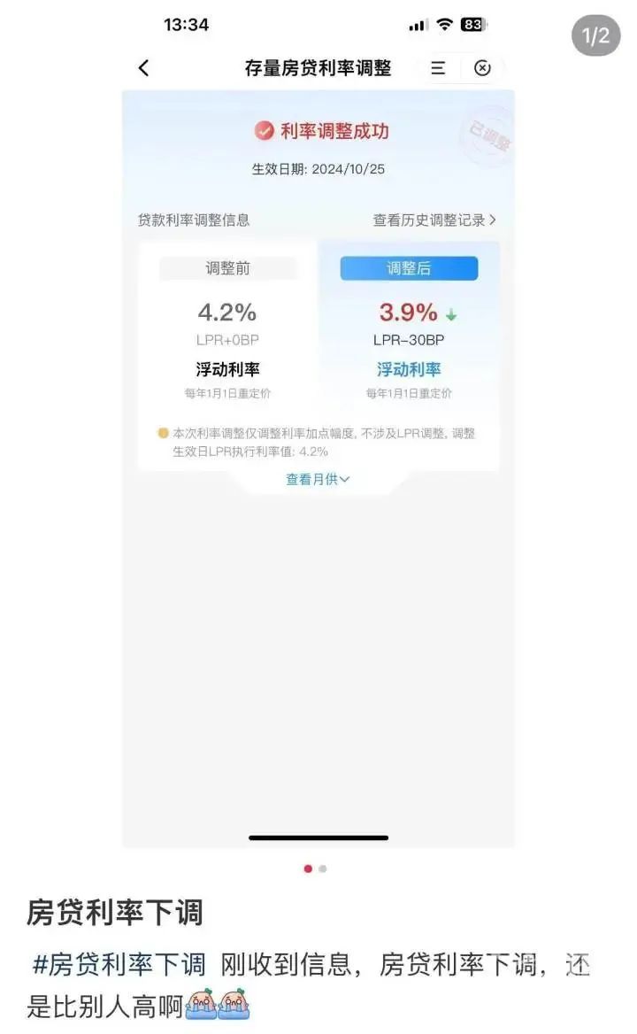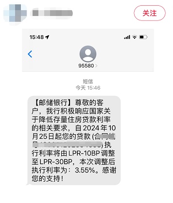 我今天其实也登录网银看了,确实是我首套变成了减30个bp,还挺好的,有3.55%。每个月多了几百块钱可以消费,能多吃两顿好一点的午市套餐了。