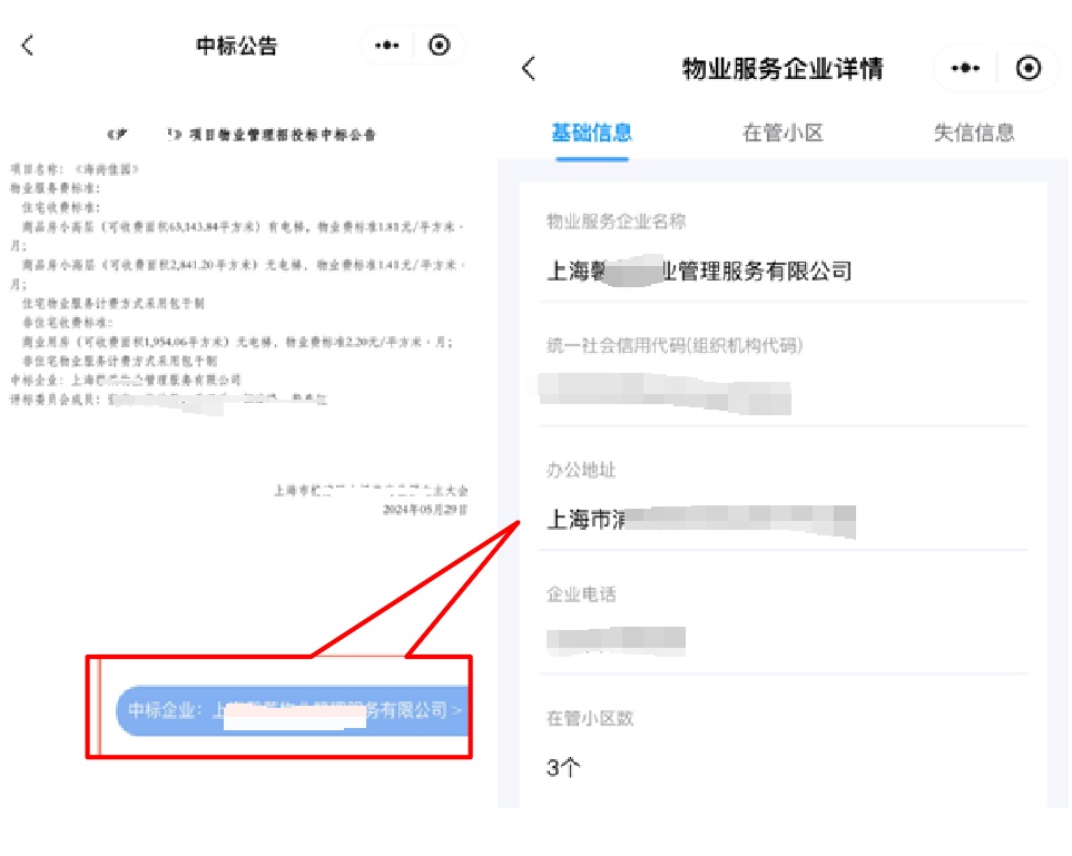 可快速查看本小区物业服务企业的企业名称、办公地址、电话等基础信息,还可查看该物业服务企业的在管小区和失信信息。