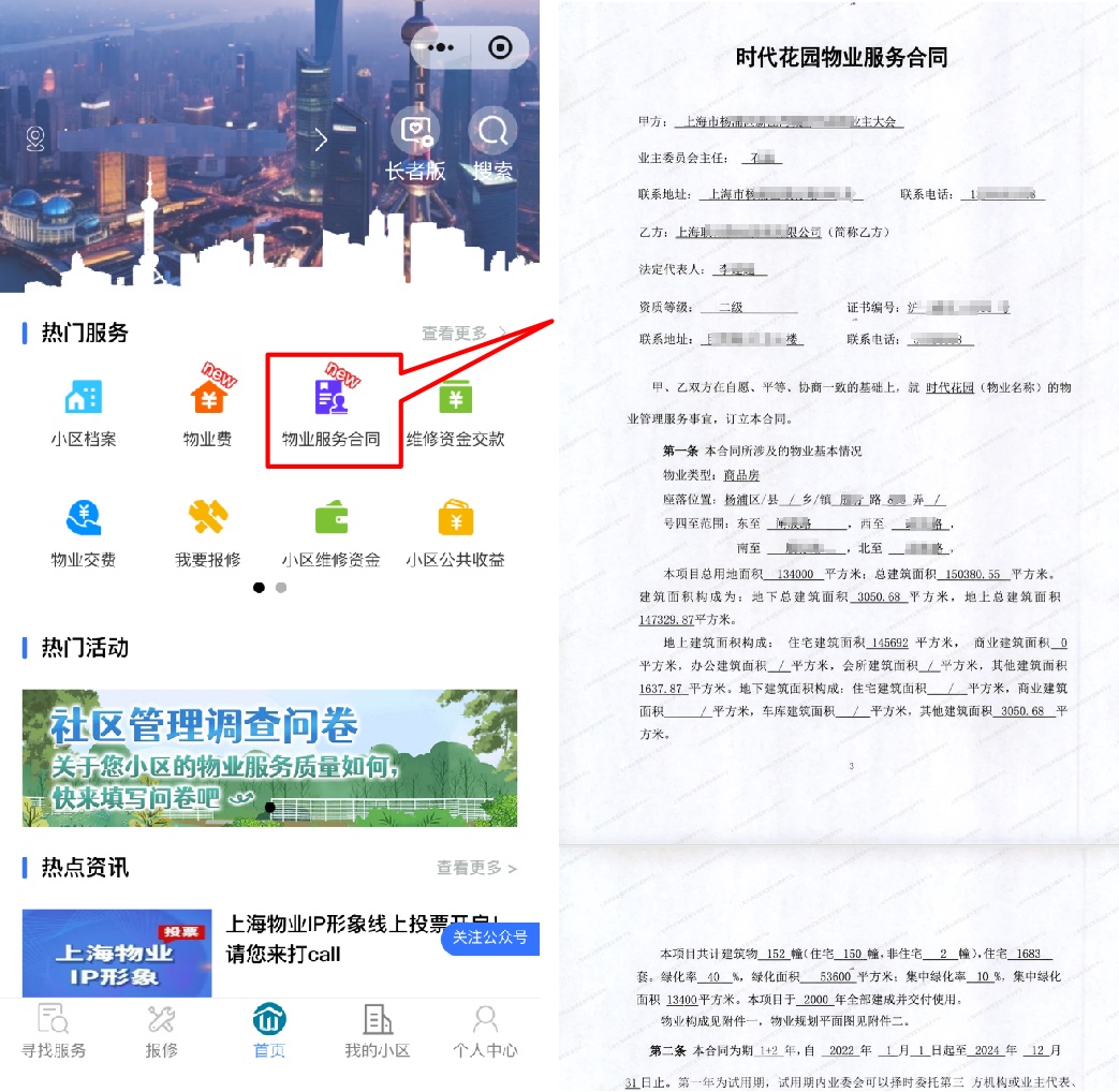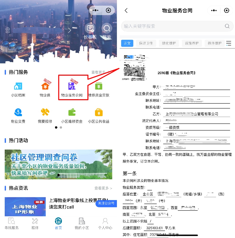 点击首页“热门服务”-“物业服务合同”,查看物业服务合同。