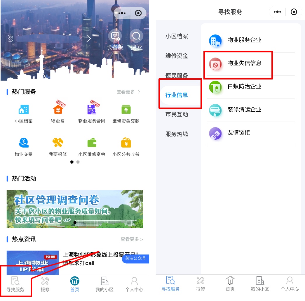 点击左下角“寻找服务”-“行业信息”-“物业失信信息”,可查看物业企业和项目经理的失信内容和记分等。