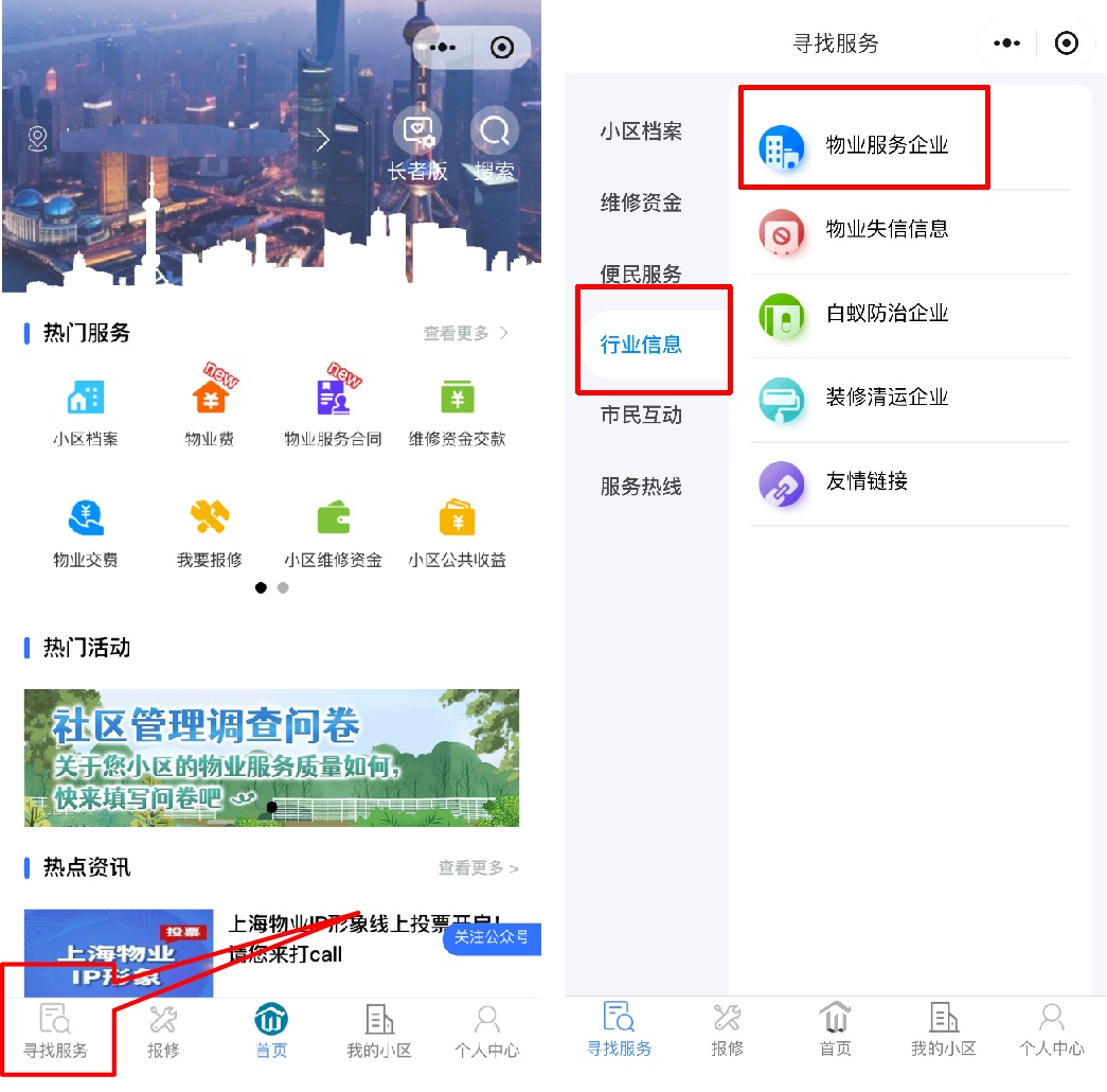 点击左下角“寻找服务”-“行业信息”-“物业服务企业”-点击任意企业,即可查看该企业基础信息、在管小区和失信信息。