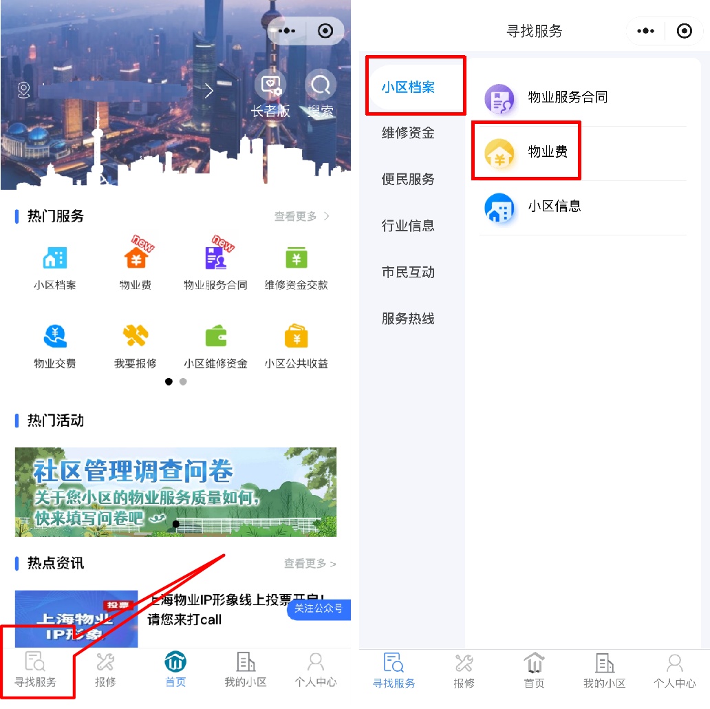 或者点击左下角“寻找服务”-“小区档案”-“物业费”,也可找到“物业费”功能。