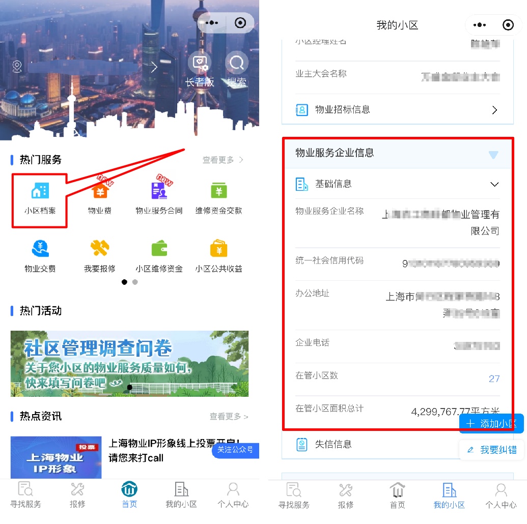 点击首页“热门服务”-“小区档案”,可查看小区物业服务企业的在管小区和失信信息。