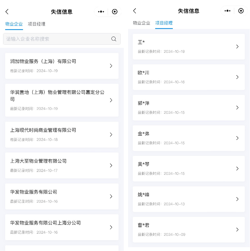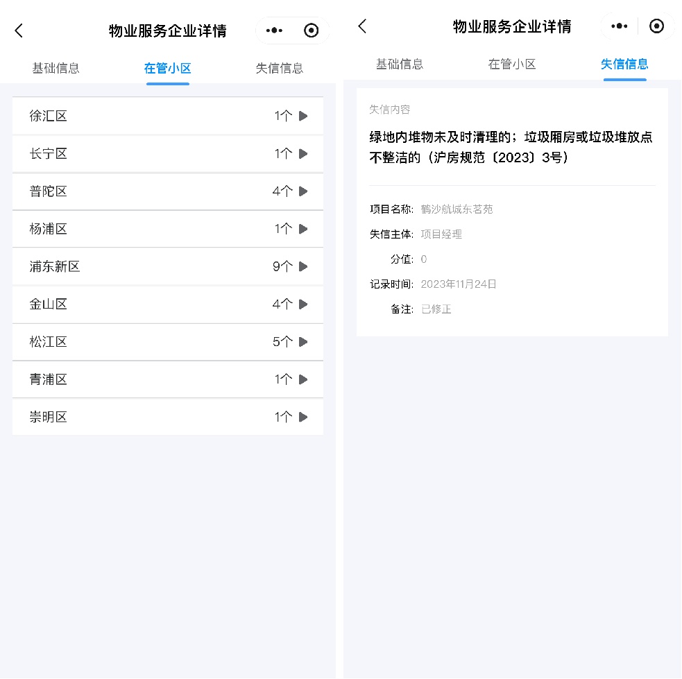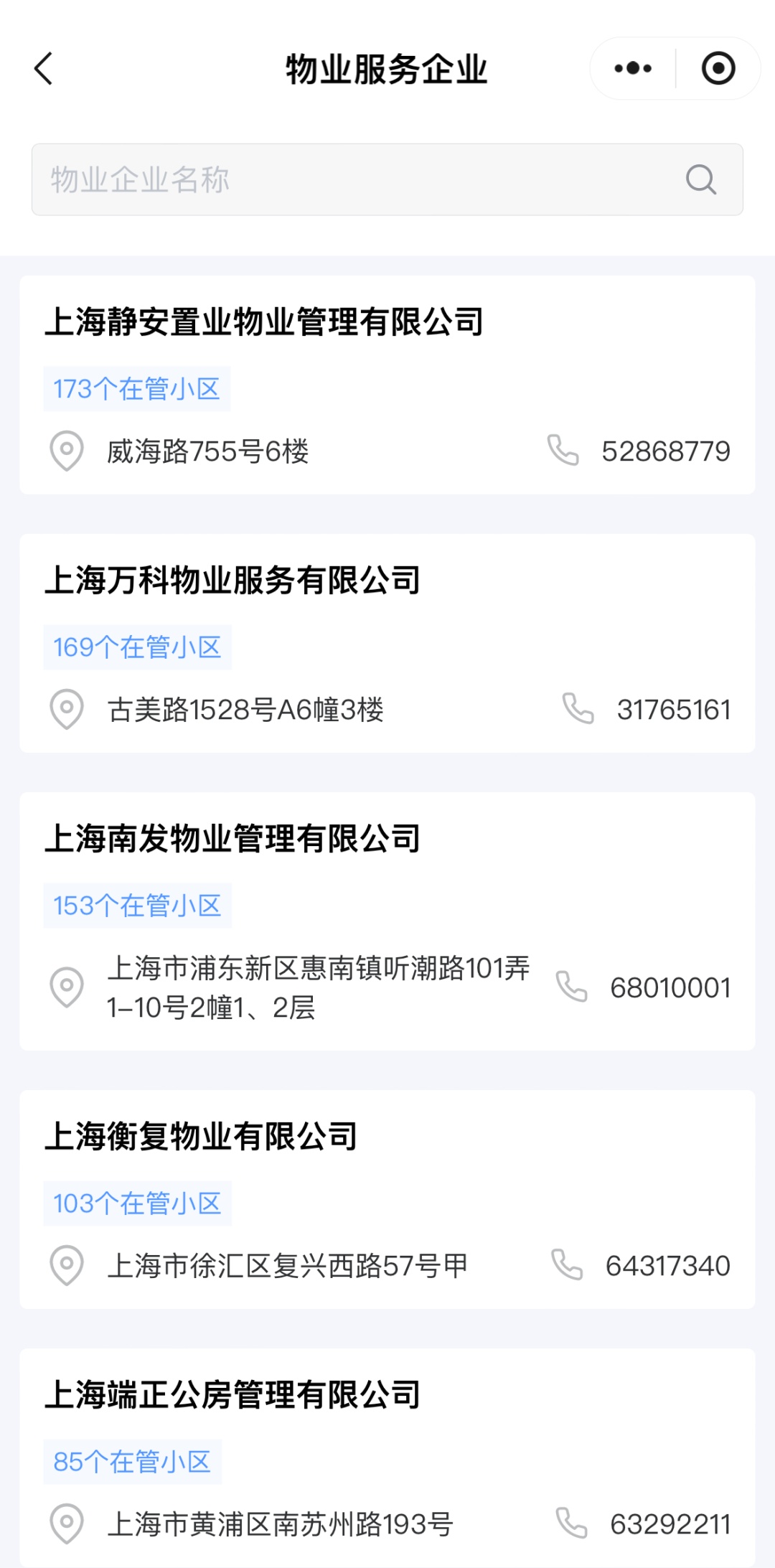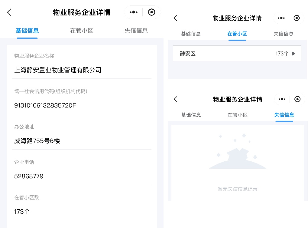 除了可快速查看本小区物业服务企业信息外,还可查看全市物业服务企业的基础信息、在管小区和失信信息。