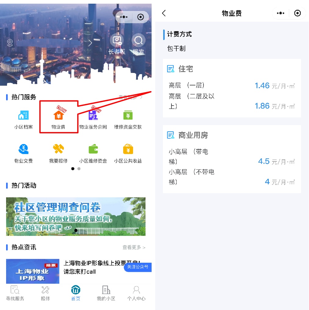 点击首页“热门服务”-“物业费”,查看收费标准。