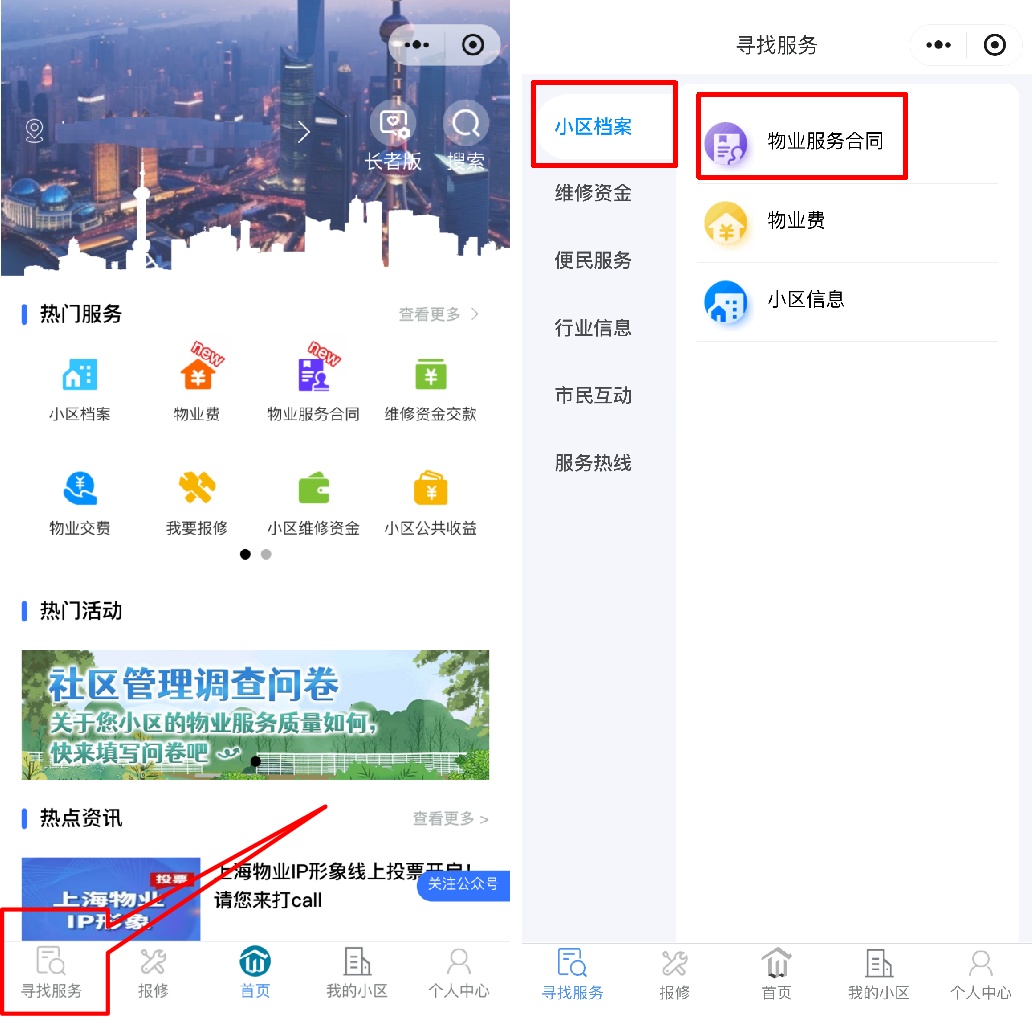 或者点击左下角“寻找服务”-“小区档案”-“物业服务合同”,也可找到“物业服务合同”功能。