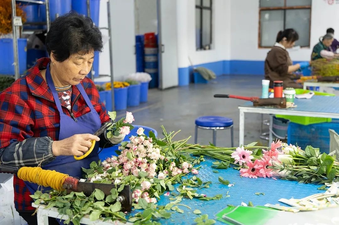 离开瑾雄生态园,来到心悦合作社的鲜花基地,仿佛踏入了一个“美丽”的宝藏之地。这里占地面积500余亩,有着鲜花育种、育苗、包装、销售、配送一体化的产业链,基地平均每天有3至5万枝鲜切花从这里发出,供应给叮咚、美团、大润发等在华东区域的十几个仓库。