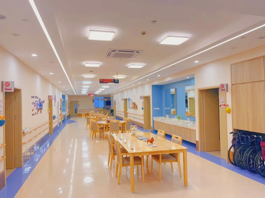 公共区域同样精心布置。原木色的桌椅、干净的洗手台、心形照片墙、毛绒玩具……充满童趣与活力。