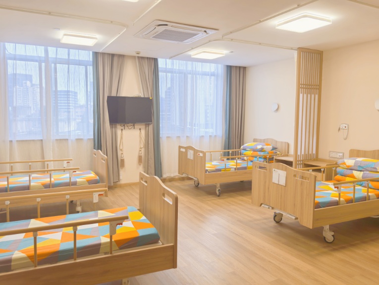 房型方面,养护院提供单人间、双人间、三人间和四人间等多种选择,费用也从每月5000元至8000元不等,充分考虑不同老年人的经济条件和居住需求。我们走进一间四人间,只见房间宽敞明亮,床铺整洁舒适,不仅配备了安全呼叫装置,电视机、空调、全天热水系统也一应俱全。