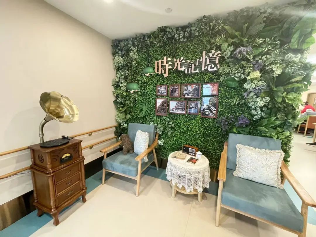 在硬件设施之外,养护院还着力营造家的氛围。五楼的入口处,一个名为“时光记忆”的角落吸引了我们的注意。留声机、眼镜等老物件以及上海旧时光的照片墙,不仅唤醒了老年人的美好回忆,更让他们感受到了家的温暖和幸福。