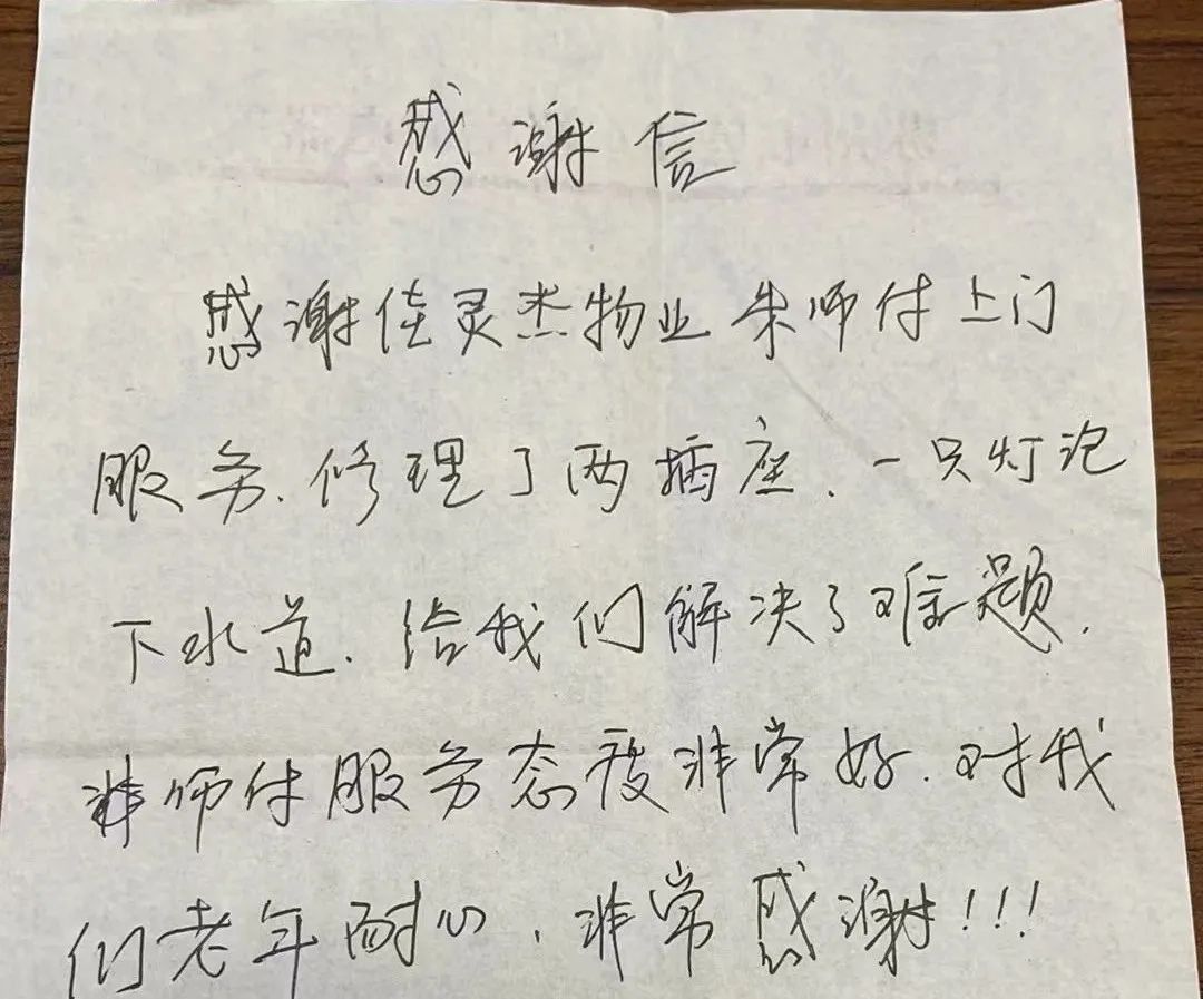 近日,佳灵杰公司收到来自梧州路299弄老人赠送的感谢信,信中表达了对公司“物业+养老”服务团队的感谢,赞扬了他们助人为乐、不辞辛劳、热心服务的美好品德。