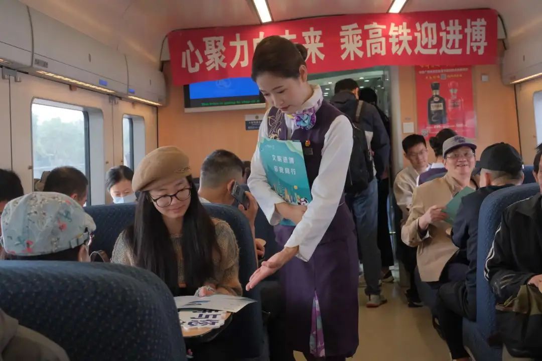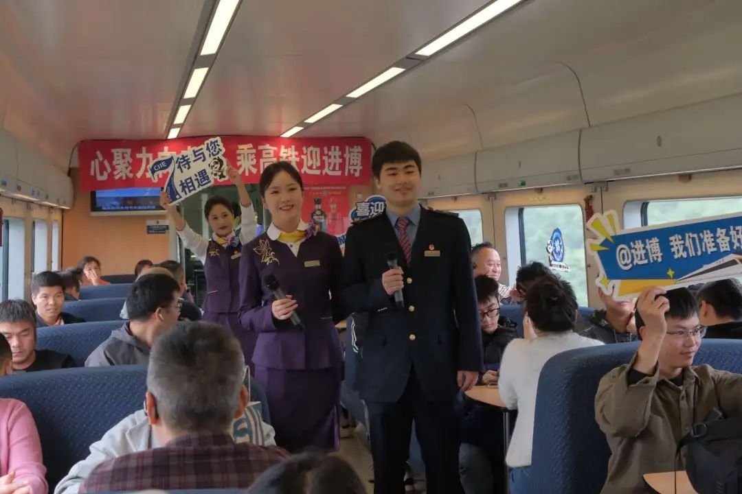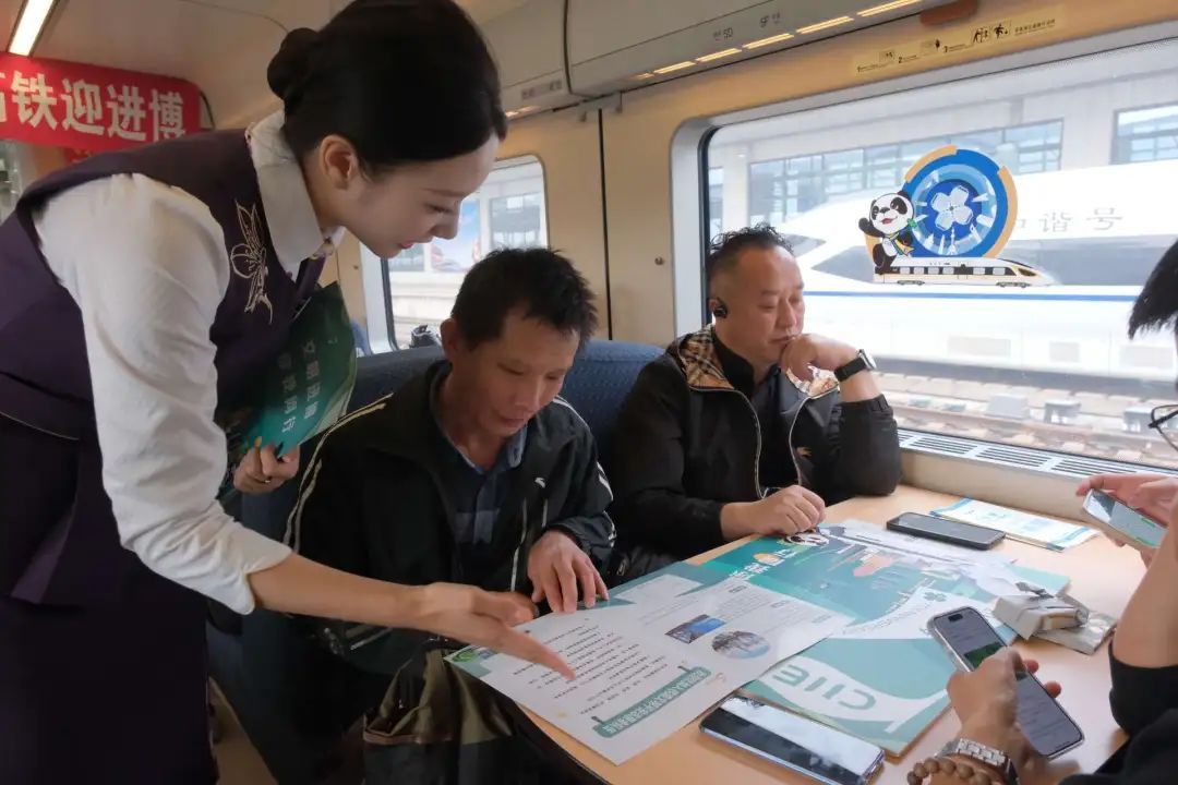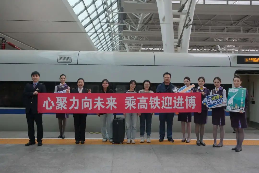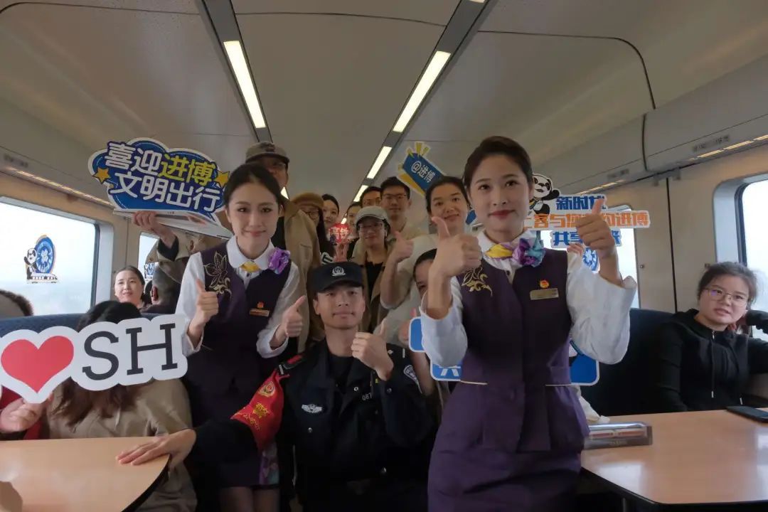第七届中国国际进口博览会开幕在即。10月28日,铁路上海客运段在D3205次列车上开展“心聚力向未来 乘高铁迎进博”主题活动,与旅客一起为进博会“打call”。