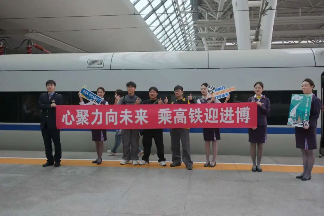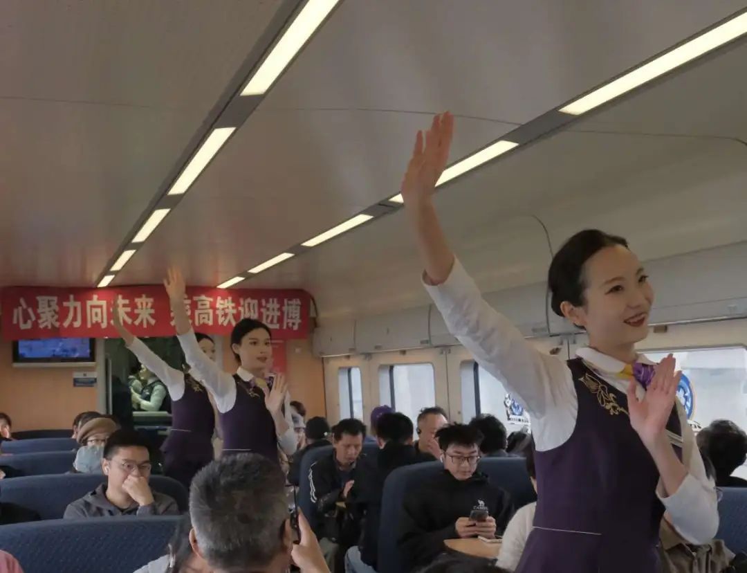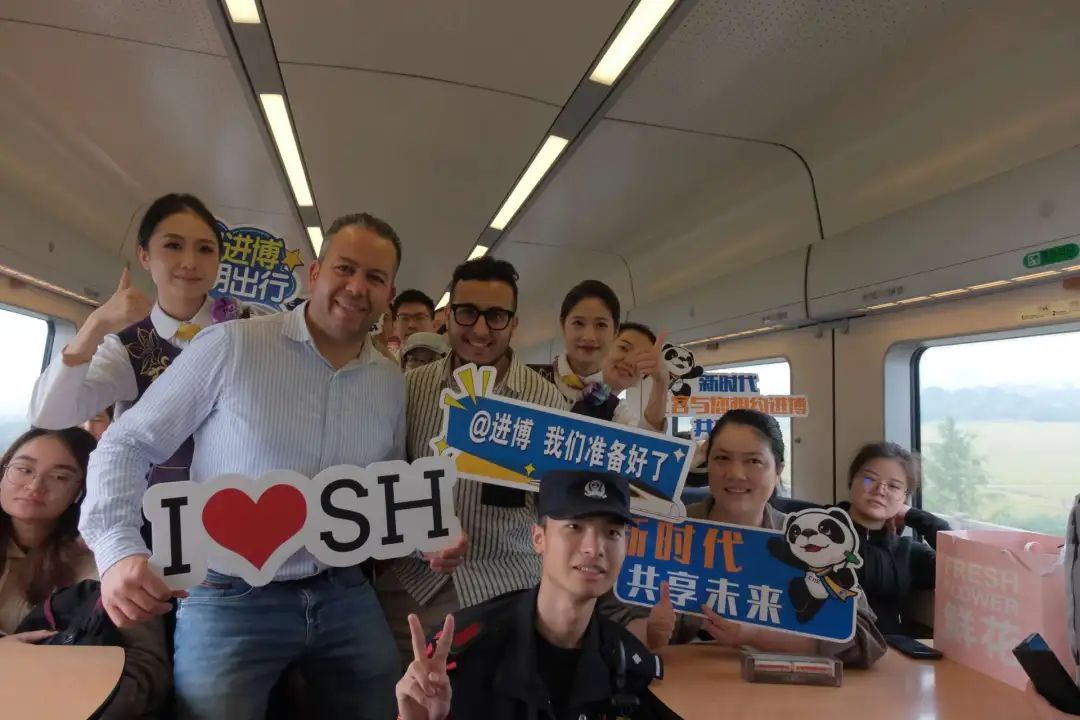 在上海虹桥站的站台上,铁路上海客运段进博志愿者在站台上手举“心聚力向未来 乘高铁迎进博”标语横幅,并晒出为进博会倒计时助力牌,旅客纷纷写上了自己的祝福并签名留影,为进博会“打call”。 随着D3205次列车缓缓启动,活动在主持人的介绍中拉开帷幕。整个车厢内,充满了浓厚的迎进博氛围。列车工作人员精心布置了列车车厢,悬挂横幅,用带有“四叶草”进博会吉祥物图样的窗贴装饰车厢,让整个车厢充满了浓厚的迎进博氛围。 “您知道进博会的口号吗?”列车策划了进博会知识问答,宣传进博会精彩亮点,普及进博会知识,现场旅客踊跃举手抢答,车内的气氛立刻活跃起来,旅客们纷纷拿出手机记录这一刻。 “这里是上海,梦开始的地方,我们都是年轻的力量。”伴随着《年轻的力量》的歌声响起,车厢气氛达到高潮,旅客们随着歌声打起了节拍。 活动最后,列车工作人员和车厢旅客合影留念,记录下这一美好的时刻。