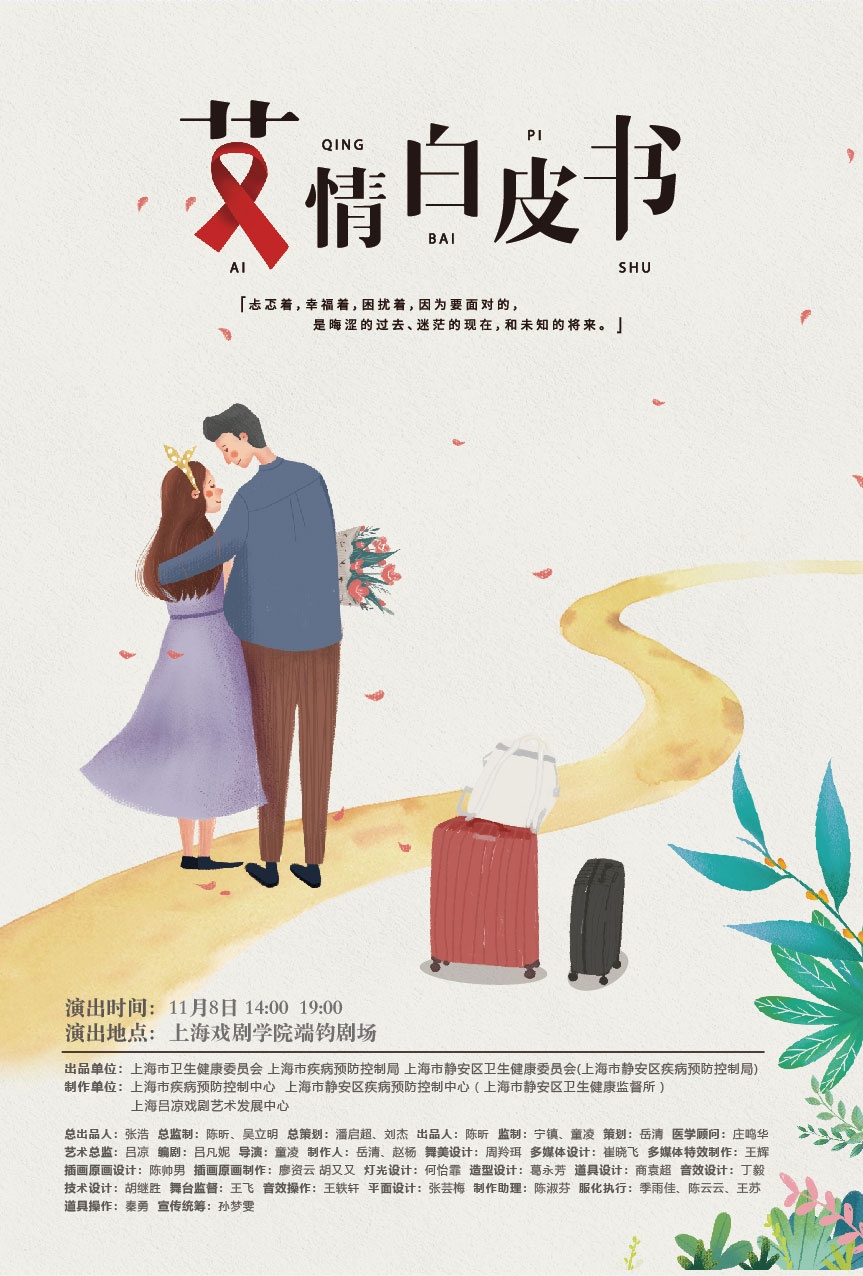 为迎接12月1日世界艾滋病日,增强公众对艾滋病的科学认知和理解,积极倡导包容、平等的社会氛围,由上海市疾病预防控制中心、上海市静安区疾病预防控制中心(上海市静安区卫生健康监督所)、上海吕凉戏剧艺术发展中心制作,联合上海市卫生健康委员会、上海市疾病预防控制局、上海市静安区卫生健康委员会(上海市静安区疾病预防控制局)出品的话剧“艾情白皮书”将于11月8日亮相上海戏剧学院端钧剧场。