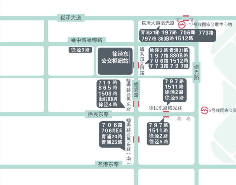 展会期间,71路区间线延伸运营。 起讫站:黄陂北路~P5停车场 设站:途经71路区间延伸线黄陂北路至吴宝路各站,吴宝路至P5停车场直达 发车间隔:5~15分钟 运营时间:黄陂北路-P5停车场7:00-18:00 P5停车场→二层步廊→国家会展中心(东登录厅)。 场馆周边公交车站 71路区间延伸线