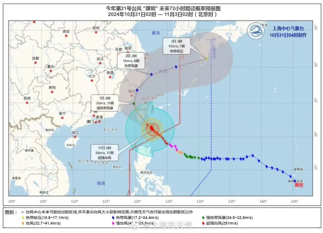 注意 今天下午转雨 此轮大风大暴雨天气过程将出现 极端降水、狂风暴雨 台风天非必要不外出 台风影响 今年第21号台风“康妮”(超强台风级),今天04点钟中心位置已经到达距离台湾省台东市东南方向约230公里的洋面上。中心气压925百帕,近中心的最大风力17级(58米/秒),离中心大约320公里的地方风力有8级。台风中心目前正以每小时25公里的速度朝西北方向移动。