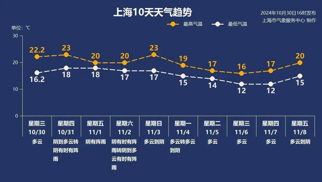 伴随此次风雨过程,周五和周六气温下降,最高气温仅20℃。周日申城天气恢复平静,气温回升,最高气温升至23℃。下周上海以多云天气为主,随着冷空气南下,气温下降明显。