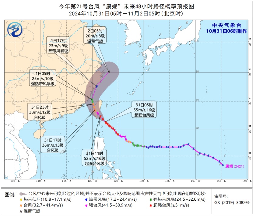 10月31日08时至11月1日08时,受冷空气和“康妮”的共同影响,东海大部及钓鱼岛附近海域、台湾海峡、台湾以东洋面、巴士海峡、南海北部及东沙群岛附近海域、浙江沿海、福建沿海、台湾岛沿海将有7-9级大风,阵风10-11级;其中台湾海峡、台湾以东洋面和巴士海峡的部分海域、台湾岛东部沿海、福建中部沿海的风力有10-12级,阵风13-14级,台风中心经过的附近海面风力有13-16级,阵风17级及以上。