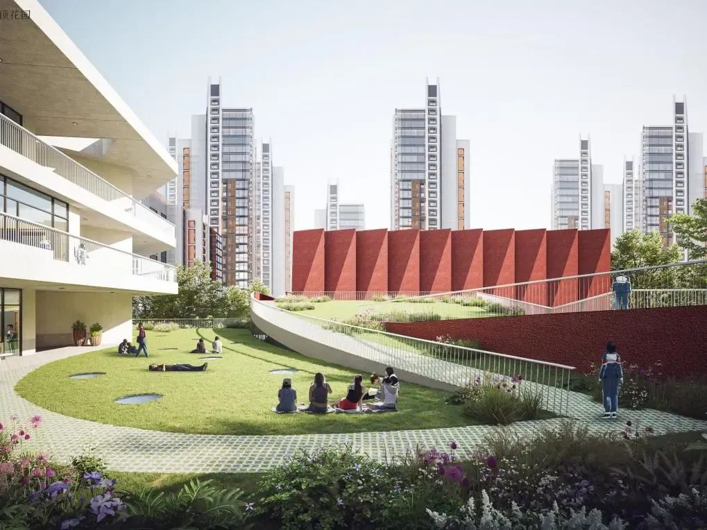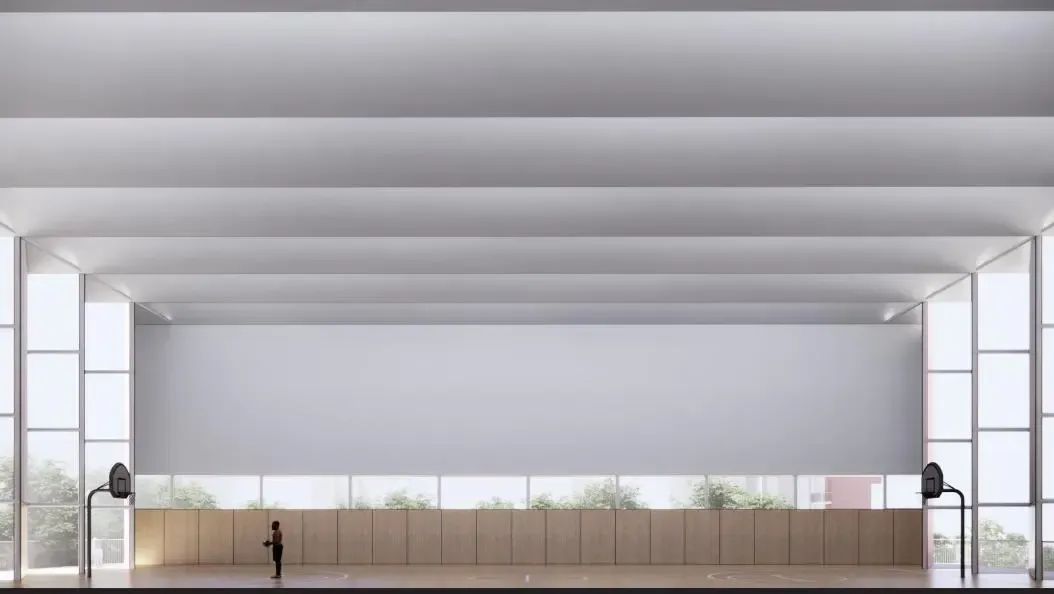 学校建筑整体形态以“绿色大地毯”为理念,建筑群如同漂浮在绿色的大地之上,各栋教学楼沿中庭环绕布局,形成开放、流动的空间,使得学生学习、活动与交流在自然过渡中无缝衔接,进一步体现教育空间与成长过程的有机结合。
