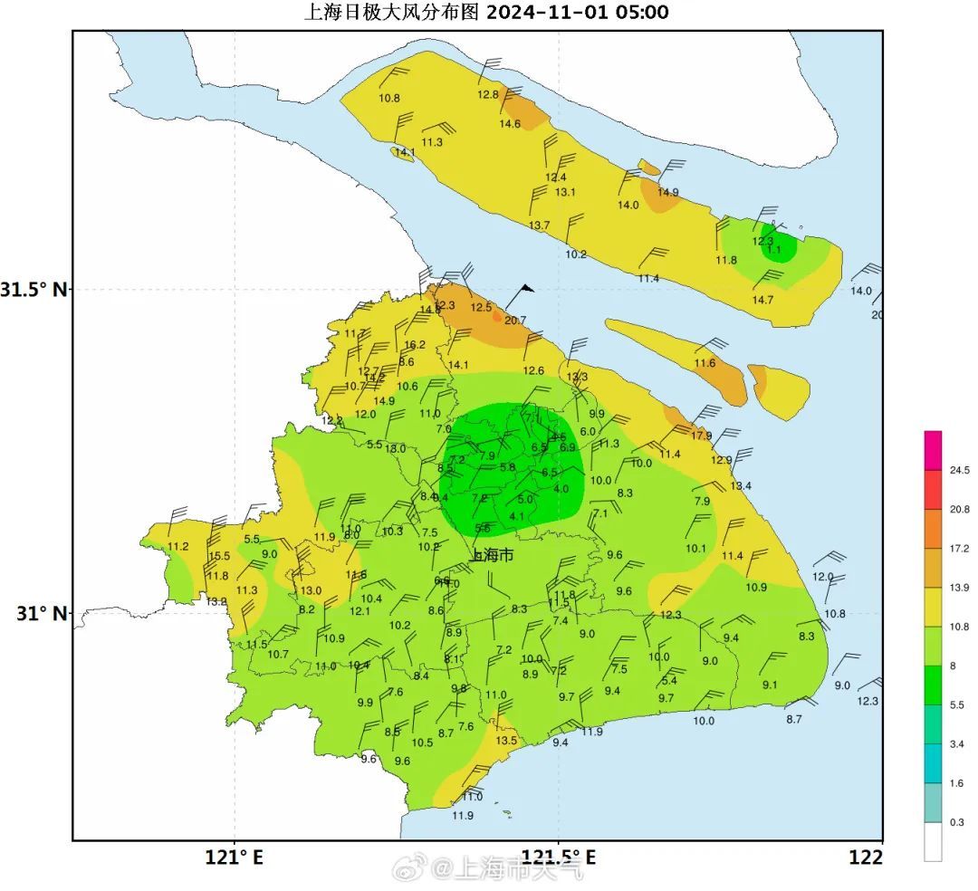 上海中心气象台介绍,昨天22时至今晨06时,本市普降暴雨,国家站中宝山最大为90.3毫米,全市各自动站中普陀甘泉路站最大为132.4毫米。陆上最大阵风风力普遍在5~6级,部分地区7~9级。