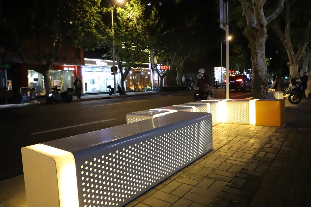 除了运城路,宜川路望景苑商业前区也完成了改造。考虑周边人流量大、非机动车穿行、商家有卸货需求等实际情况,彭浦镇以“活力方糖 为生活打气”为设计理念,采用了灵活、简约的不锈钢板座椅组合,有效利用了城市“边角”的剩余空间,平衡了人行道宽度和市民的休憩需求。夜幕下,座椅的“关节处”散发亮光,更为晚归的市民照亮了回家的路。