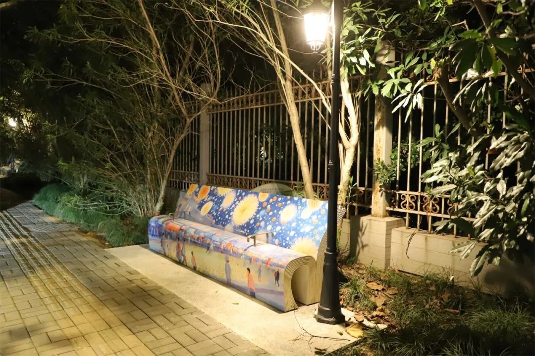 在大宁公园外,公共座椅被设计成了书本的形态,并用金属板打印技术“画”上了治愈的儿童插画彩绘。夜幕降临时,精心布置的童话氛围灯亮起,公共座椅散发出柔和的光芒,让这段路程充满童趣与温馨。