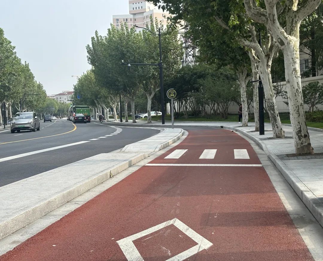 经常在老沪闵路上搭乘公交车的居民,或许都有这样的共鸣:想从人行道走到公交站台时,总会有非机动车突然从面前疾驰而过,看似没有几步路,往往却成了“最远的距离”。而如今,老沪闵路上中路公交车站升级成了港湾式公交停靠站。由于多出了一块向内凹的区域,可以专门给公交车停靠,既不影响正常行驶的车流,又能让行人安全上车。此外,非机动车道也铺上了醒目的红色沥青和斑马线,提醒非机动车经过时减速慢行。