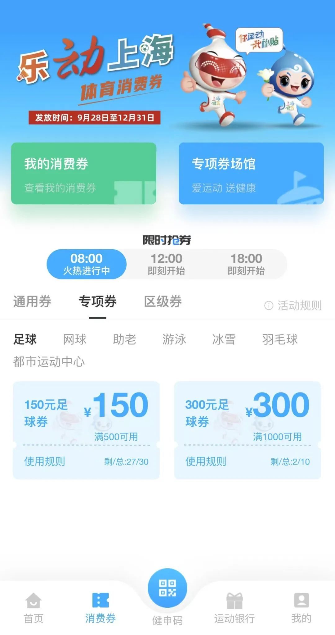 足球专项券仅限足球场地使用,每人每周最多可以领取1张,有效期为7天,设有150元和300元两种面额。其中,150元面额的单笔订单满500元即可使用,300元面额的单笔订单满1000元即可使用(以“来沪动丨健身地图”公示规则为准)。