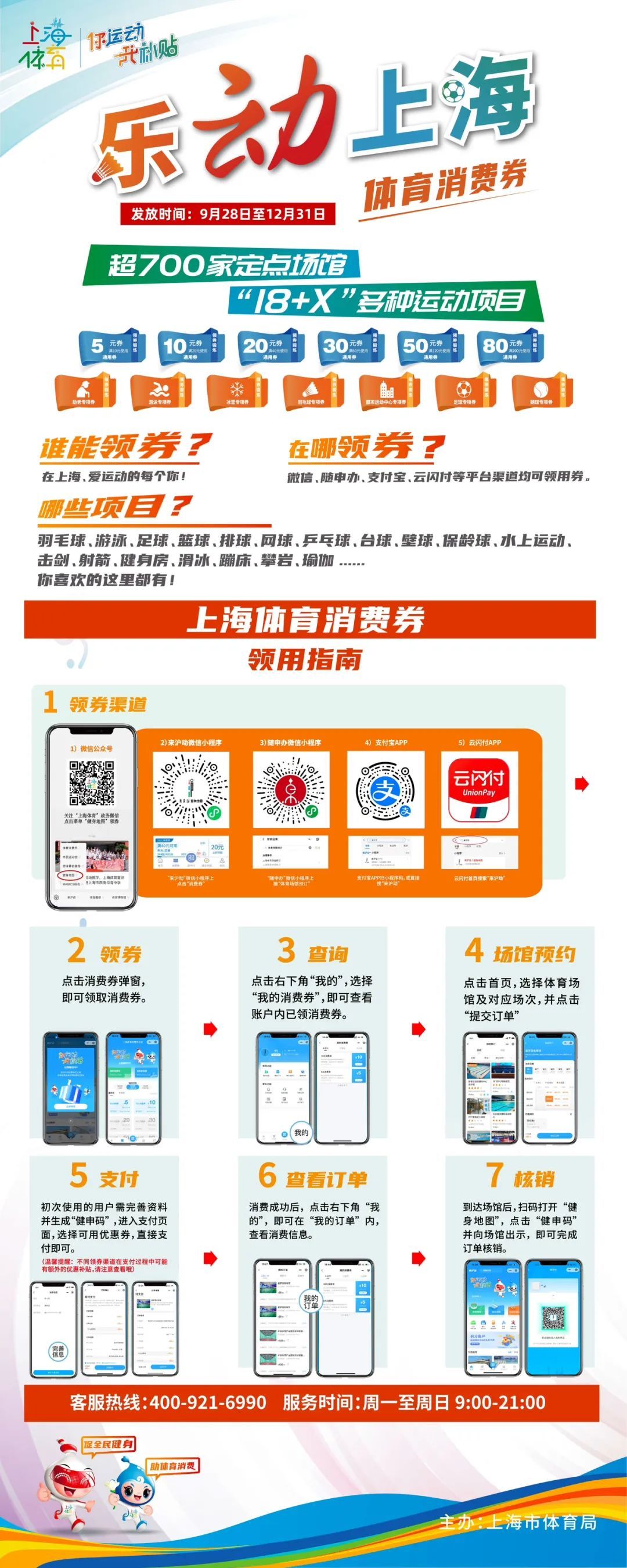 9月28日至12月31日,2024年“乐动上海”体育消费券每天8点、12点、18点三个时段发放,手机即可领取使用,兼顾不同时段市民的健身消费需求。大家可依托“来沪动丨健身地图”小程序,通过微信、支付宝、云闪付、随申办等渠道领取和使用体育消费券。