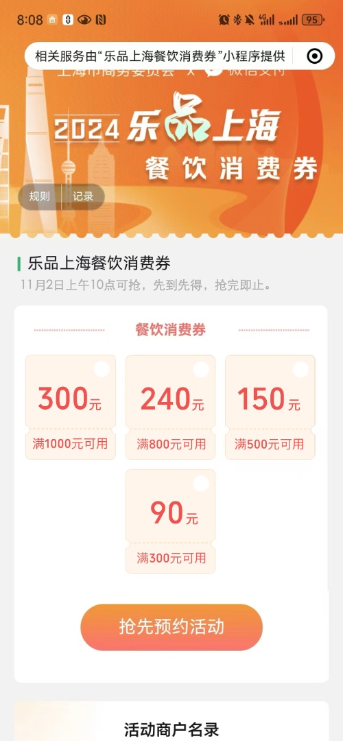 1.用户打开微信,在微信搜索框搜索“乐品上海餐饮消费券”小程序,或扫描下方小程序二维码即可进入活动页面。