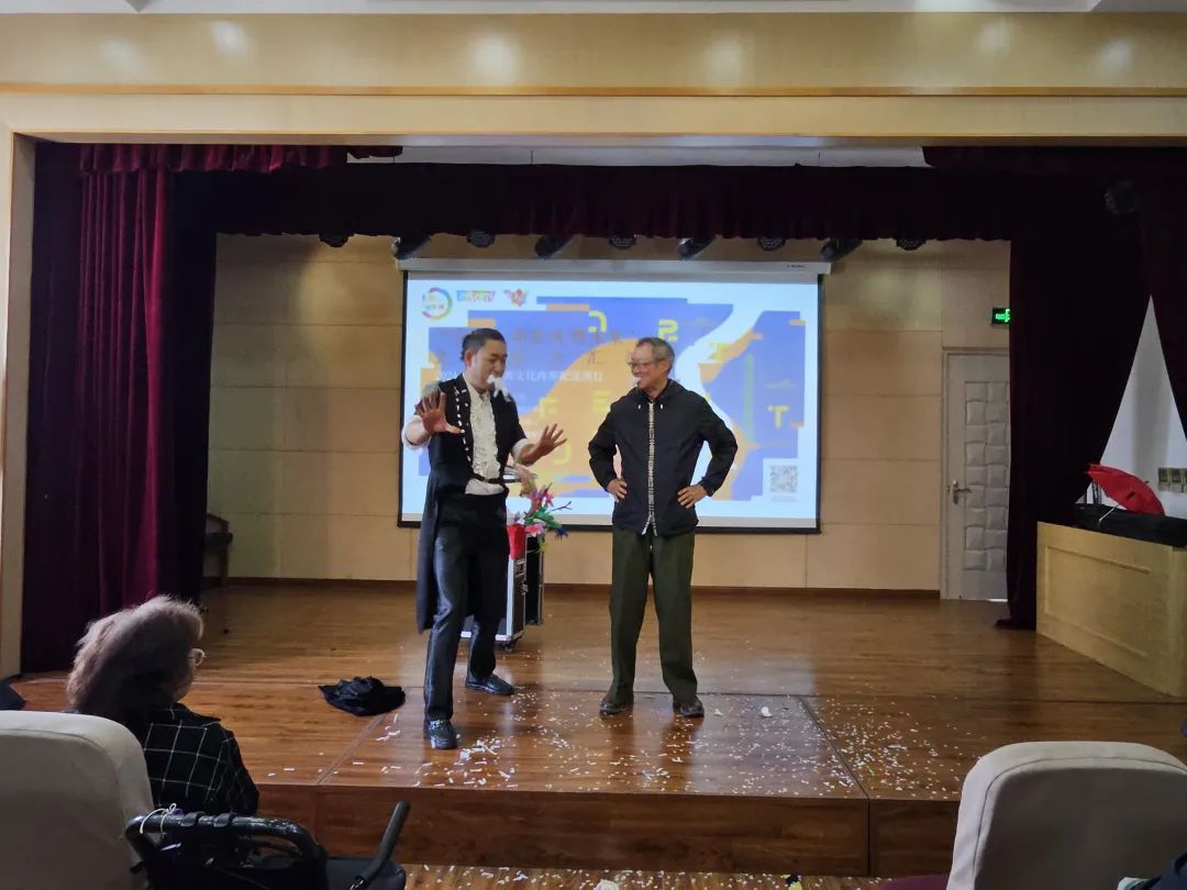 演出高潮迭起,魔术师带来的魔术表演将现场气氛推向了顶点。魔术师不仅展示了令人称奇的魔术技巧,还邀请了一位长者上台互动,共同完成了精彩的魔术表演,博得了现场观众的热烈掌声。最后,在一片欢声笑语中,整场文艺汇演圆满落下帷幕。