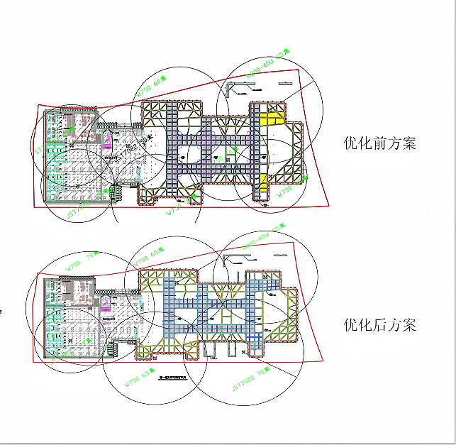 此外,项目原计划使用8台塔吊进行垂直运输,包括多种型号的重型塔吊,但此举成本高、相交面大且增加管理难度。经多次现场考察,众兴监理提出优化方案:西侧塔吊由3台减至2台,通过增加一台重型塔吊的工作半径来覆盖更广区域;东侧塔吊由5台减至4台,同样通过扩大覆盖半径减少数量,避免资源浪费,并将最东侧的重型塔吊换为轻型,较重构件改用汽车吊装。此方案获准实施后,有效降低了成本、减少了相交面、降低了施工风险及管理难度,提升了现场效率,获得广泛好评。