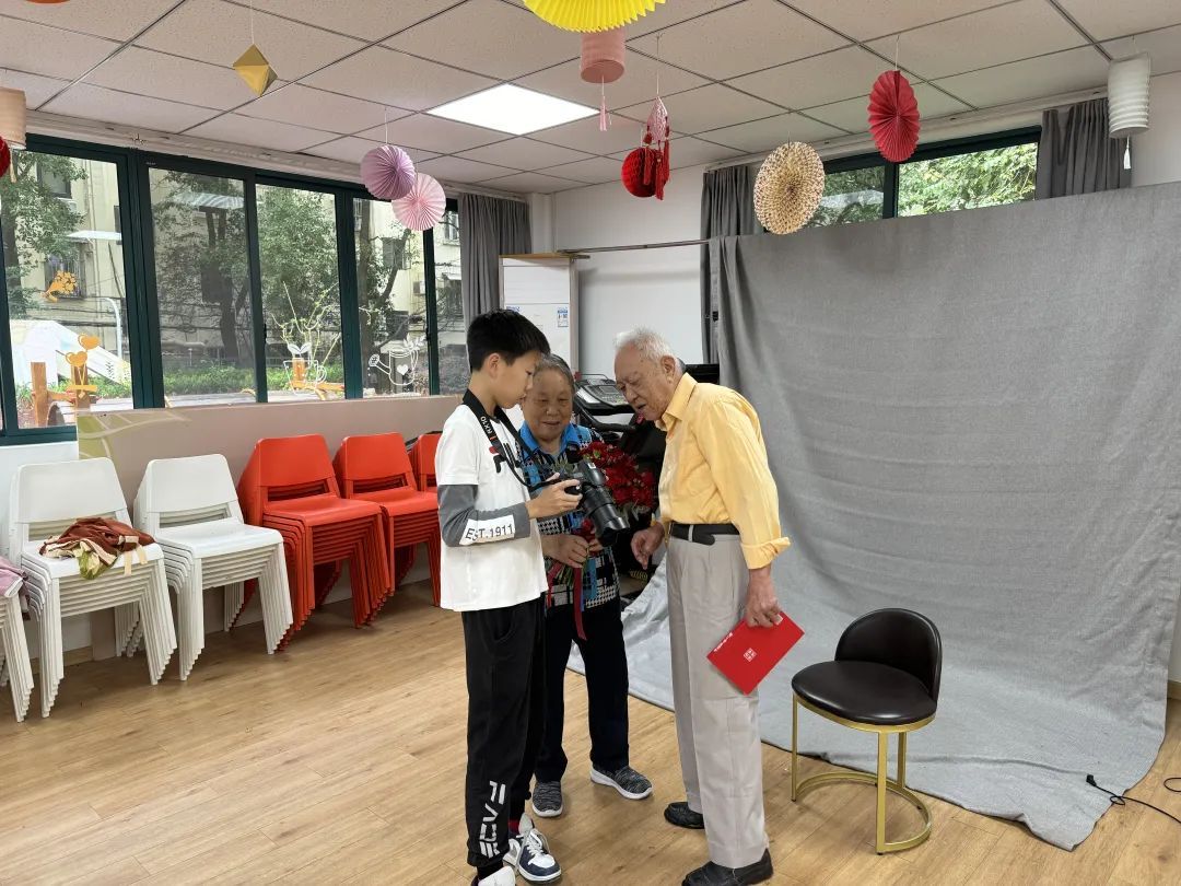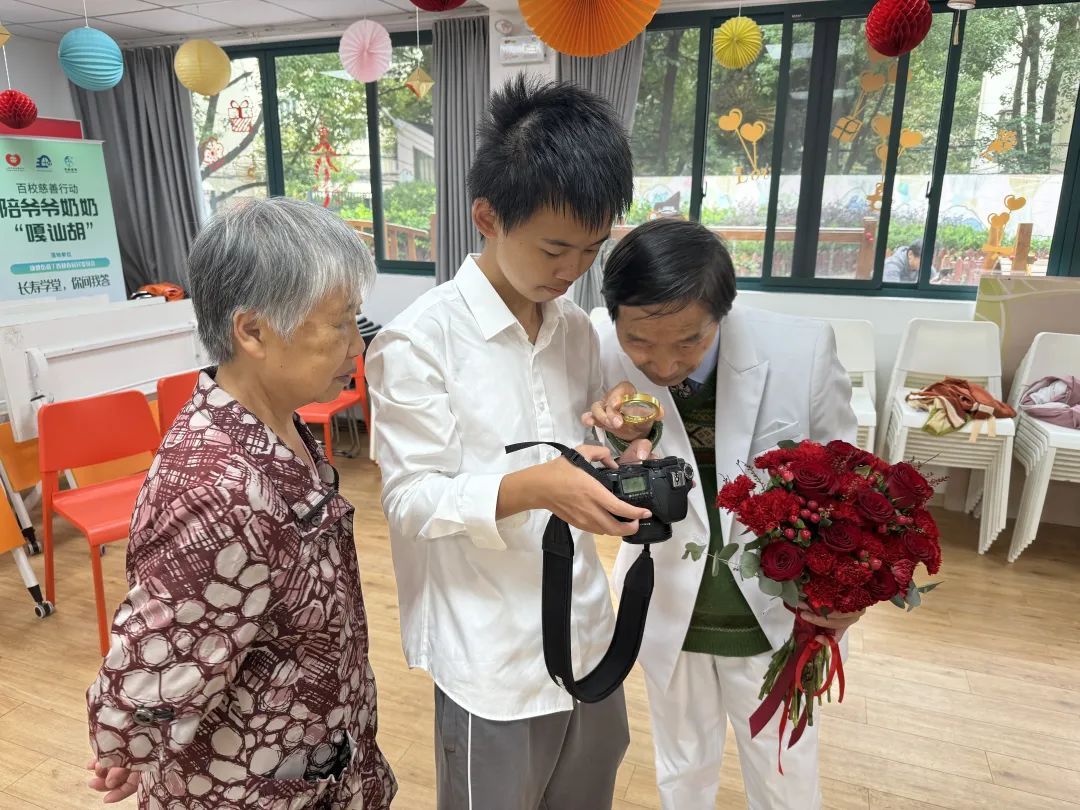 为了给老人们留下美好的回忆,居民区特别邀请了党建联建单位世外中学的学生们参与此次活动。老人们与年轻一代坐在一起,畅谈生活趣事、分享成长经历,现场气氛温馨而和谐。这些充满活力的学生们带着专业的摄影设备,走进社区,为老人们拍摄照片。在拍摄过程中,他们耐心地引导老人们摆出各式各样的拍照姿势,时而温柔地搀扶,时而亲切地交流,让老人们感受到了来自年轻一代的温暖与尊重。