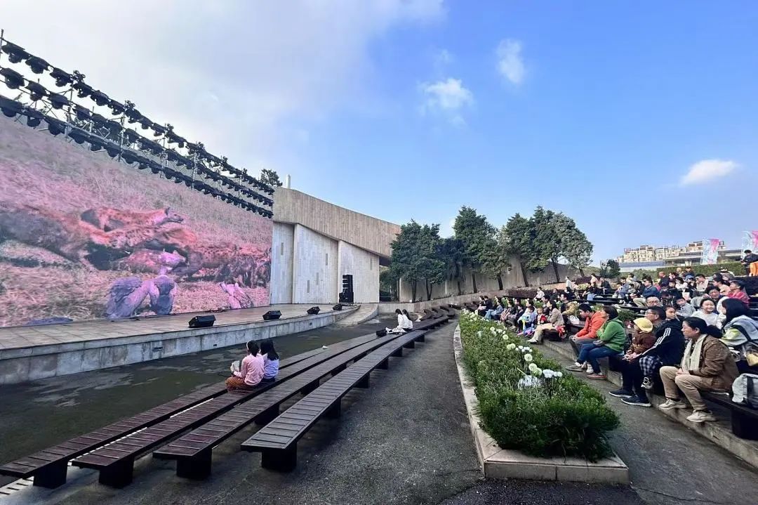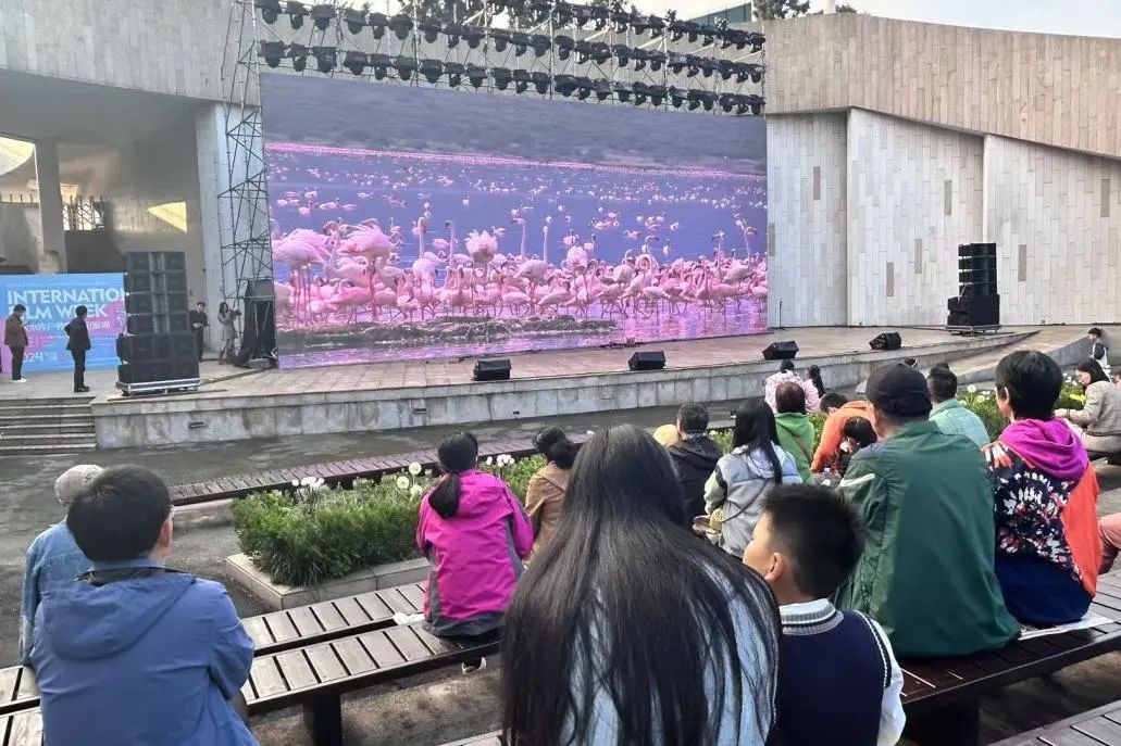 穿过草坪广场,纪录片《肯尼亚动物园神秘的海洋》正在露天剧场的巨屏上放映,台下观影者几乎座无虚席。这块长16米宽7米的户外防雨高清 LED 屏幕配备高清转码播放器,即使在阳光闪耀的白天也能带来最佳光影体验。