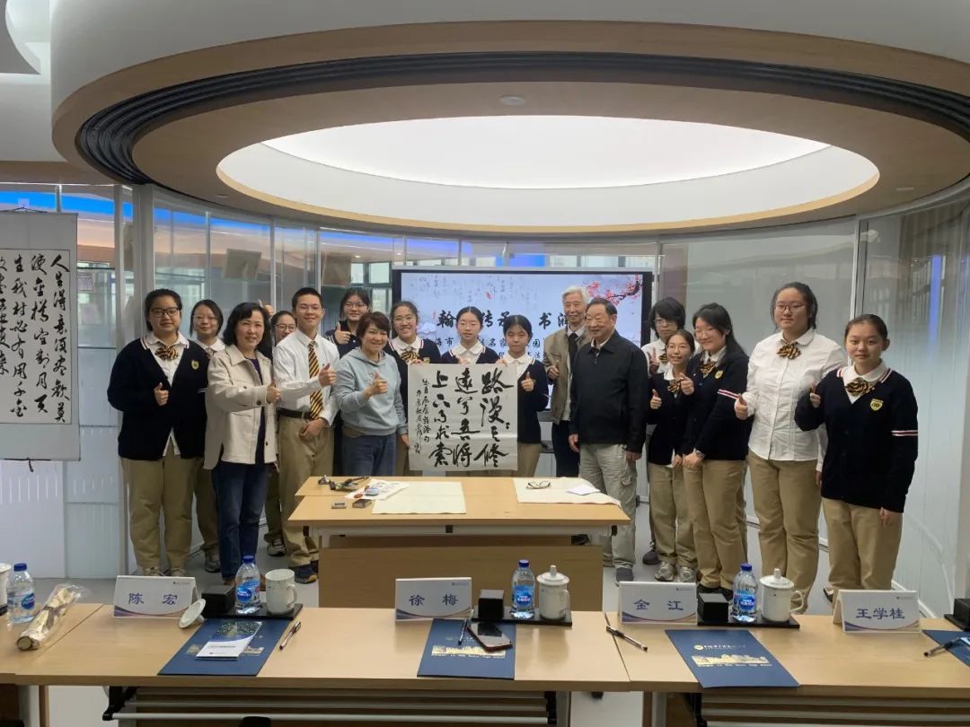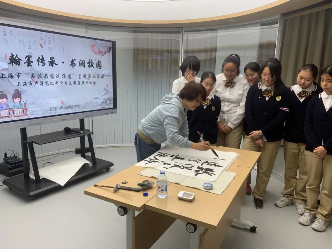 活动现场,进行了学生书法作品展示,展出了学校十余名书法爱好者学生书写的作品。徐梅还与卢湾高中的师生开展了书法互动,共同挥洒笔墨。