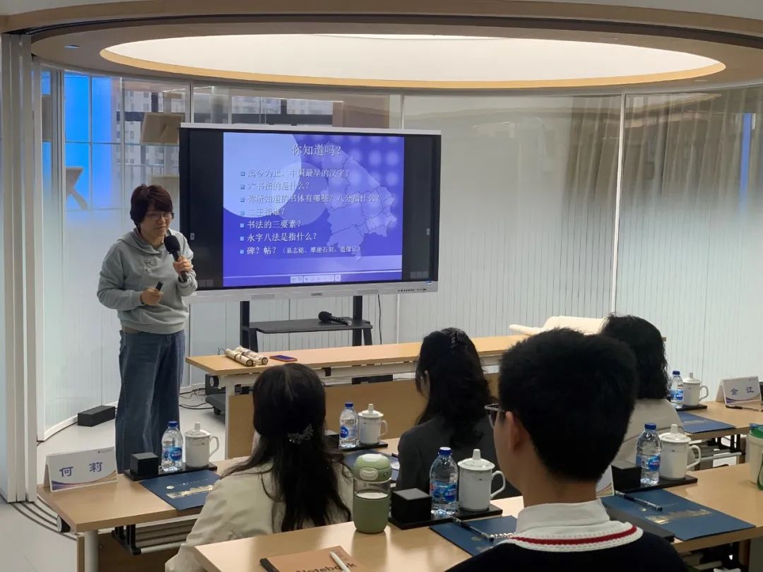 “甲骨文是一种象形文字,从‘羊’‘止’‘人’这些字中,可以观察到文字的趣味性和艺术性。”徐梅从文字的起源讲起,图画一样的甲骨文、浑厚质朴的金文、笔画圆转的小篆,王羲之的楷书、苏东坡的行书、张旭的草书……图文并茂的讲述中,学生们仿佛走进书法的世界,在字里行间感受魏晋风度、汉唐气象。