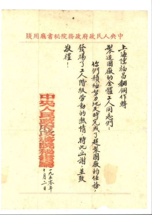 陈福昌翻铜作克服了人员少、时间紧、条件有限等困难,在1950年国庆前夕,按时顺利地完成了铸造铜质国徽这个光荣的任务。其中一枚铜制国徽,目前展出在上海市历史博物馆四楼。
