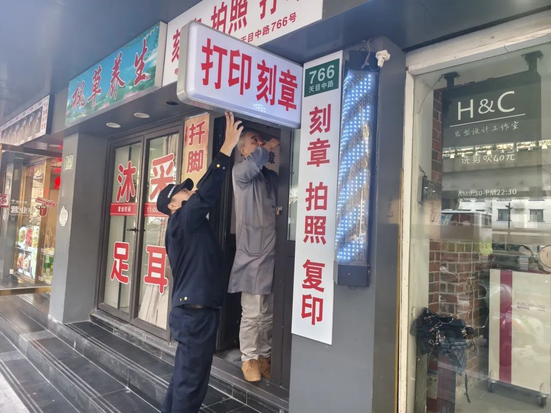 在巡查过程中,中队发现不少新开设的店铺为了招揽顾客,未经审批自行设置了“小耳朵”。执法队员向相关商户进行了教育宣传,告知其要严格按照绿化市容部门的要求设置店招。部分商户在队员的宣传沟通下,已在规定期限内进行了自行拆除整改。执法队员还对天目中路两家拆除有困难的商户进行了帮拆,有效提升了辖区的市容市貌和安全系数。