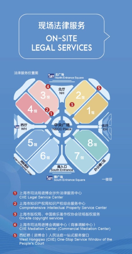 进博会期间,展会现场设4处法律服务点位,分别为进博会涉外法律服务中心、知识产权综合服务中心和进博会调解中心(商事调解中心)和西虹桥(进博会)人民法庭,届时将延续场内场外和线上线下相结合的方式,为展客商提供更加便利的法律服务。