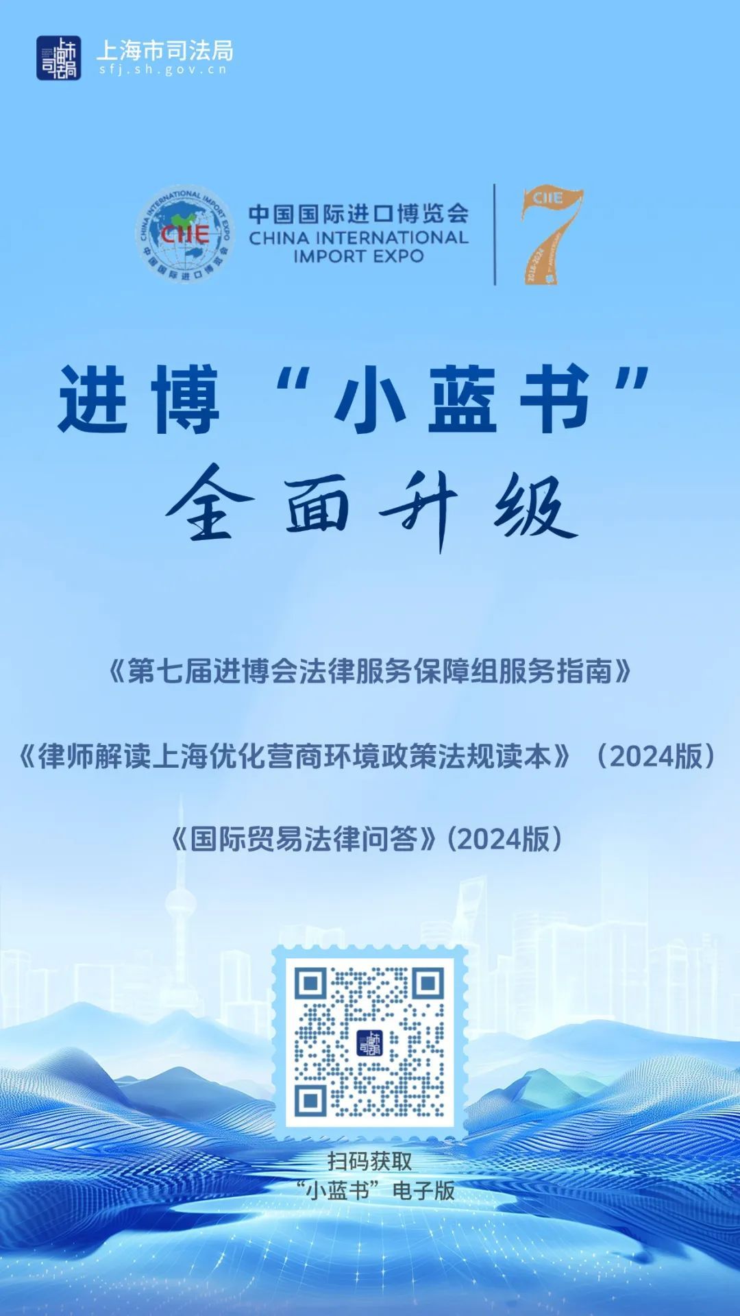 今年,第七届进博会“小蓝书”家族再升级,由市司法局牵头法律服务保障成员单位编写的法律服务保障组服务指南、上海优化营商环境政策法规读本和国际贸易法律问答中英双语读本“新鲜出炉”。